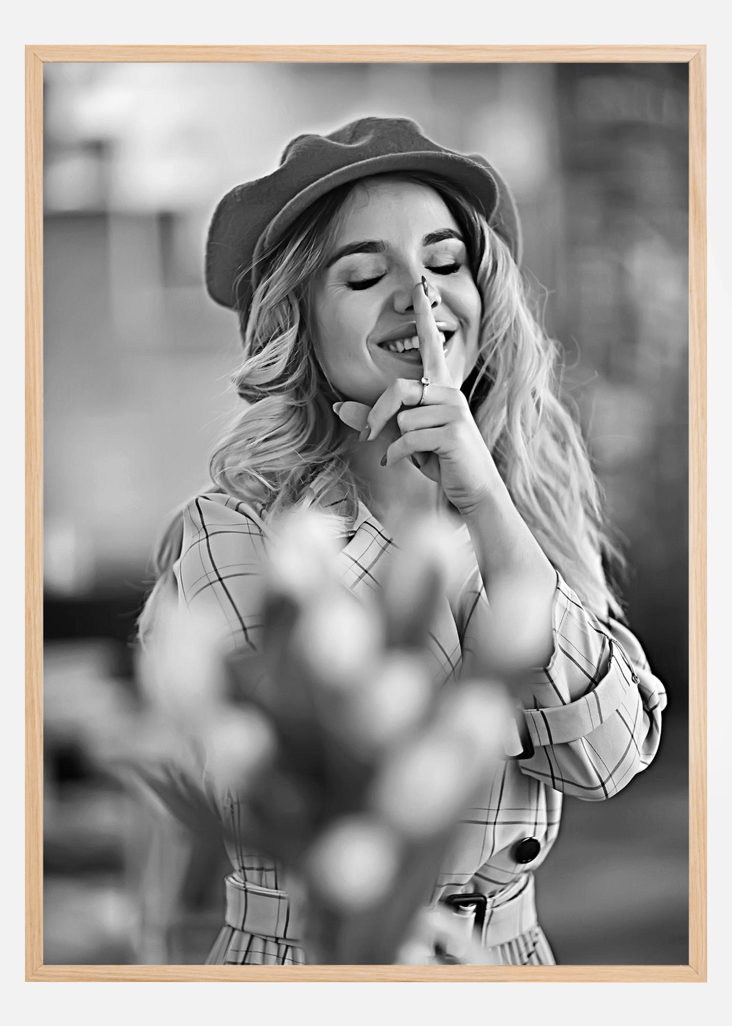 Um retrato ousado de uma menina com o dedo nos lábios. O cabelo loiro cai sob o seu chapéu e esta menina adorável sorri amplamente enquanto levanta um dedo tranquilizador para os lábios. Esta obra em preto e branco vai melhorar o seu humor todos os dias quando acordar e vê-la.