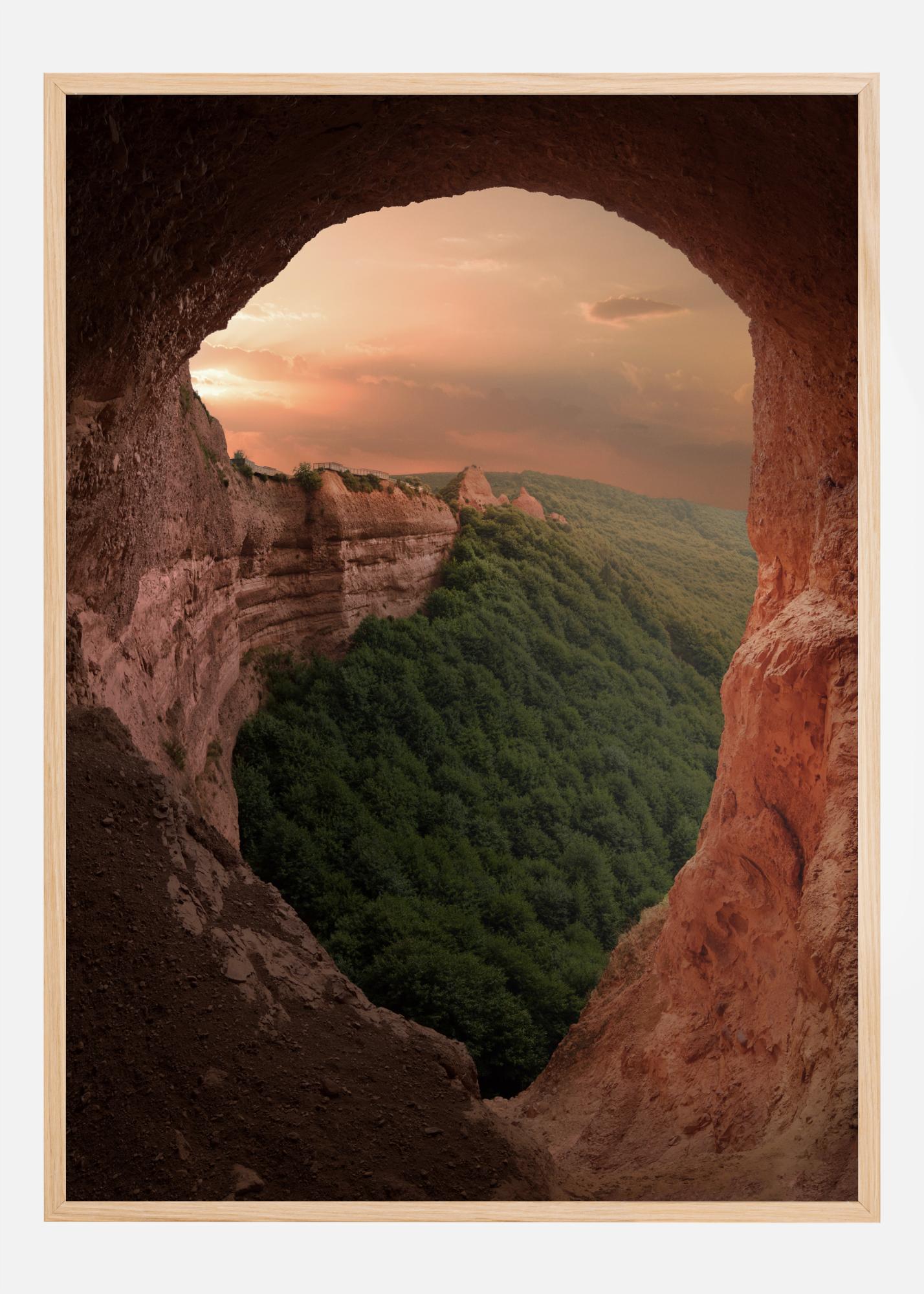 Um impressionante cartaz com uma paisagem vermelha dramática. Olhe através da abertura na rocha para ver as falésias vermelhas que se estendem ao longe. As árvores verdes em crescimento constituem o contraste perfeito quando o sol se põe e lança um brilho quente sobre tudo. Visite este lugar de casa.
