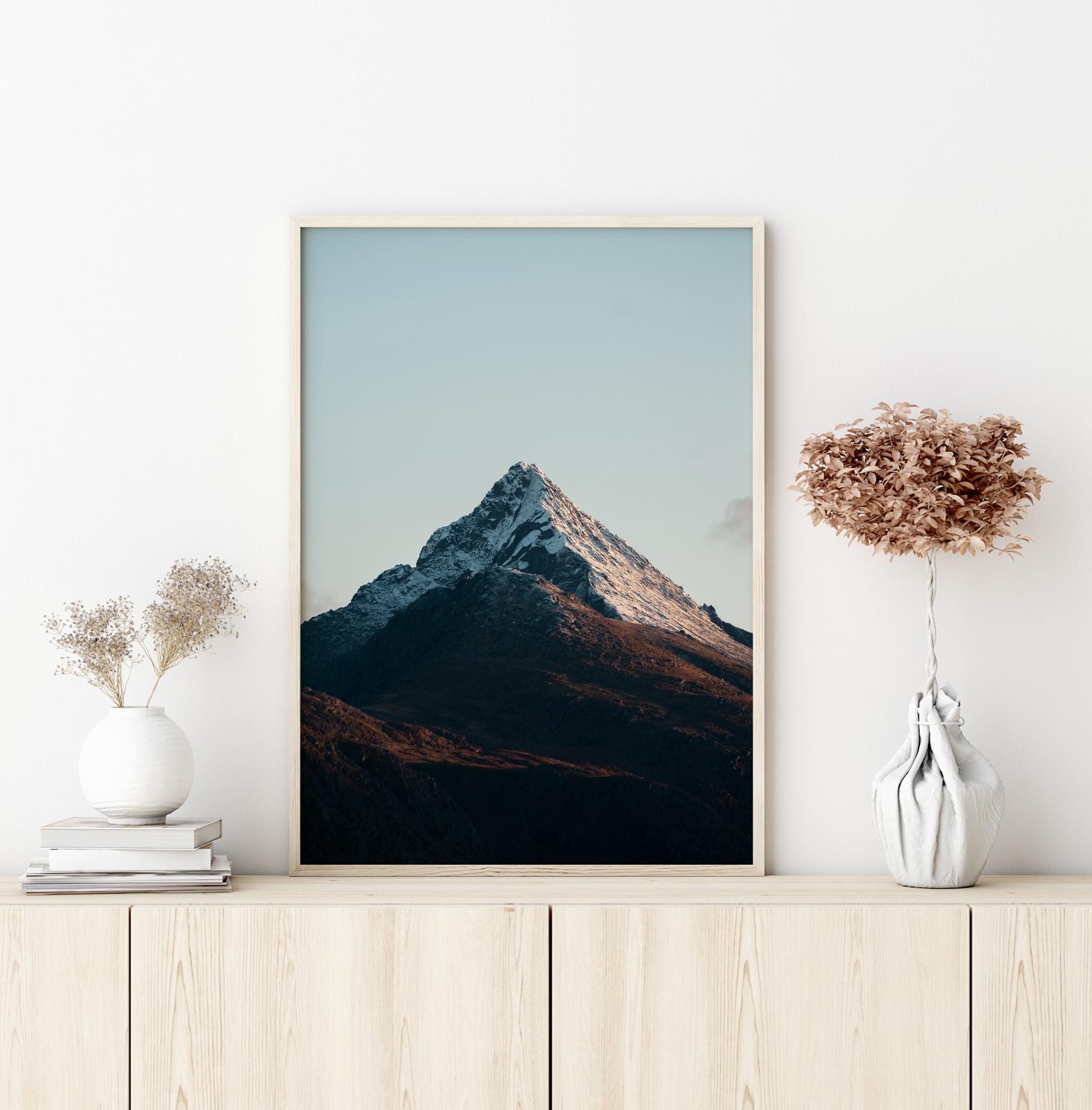 Um póster forte com um pico de montanha solitário que se eleva alto contra um céu claro e luminoso. O topo coberto de neve é quase um triângulo perfeito que atrai o olhar para o topo de uma maneira dramática. As temperaturas frias podem ser sentidas através desta imagem impressionante.