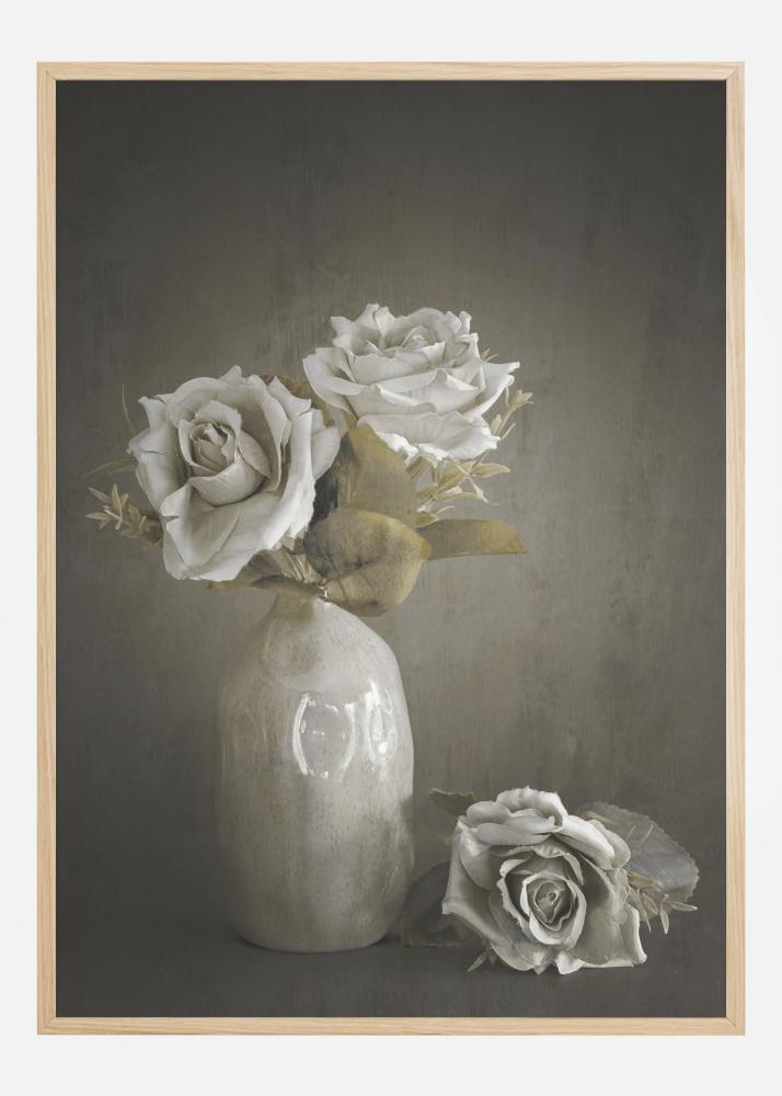 Um simples póster com rosas pintadas em um vaso. Duas rosas brancas estão em um vaso branco, uma terceira rosa está colocada na prateleira ao lado. Cada rosa brilha com uma luz invisível num fundo cinzento escuro suave, criando uma imagem elegante, mas ainda teatral.