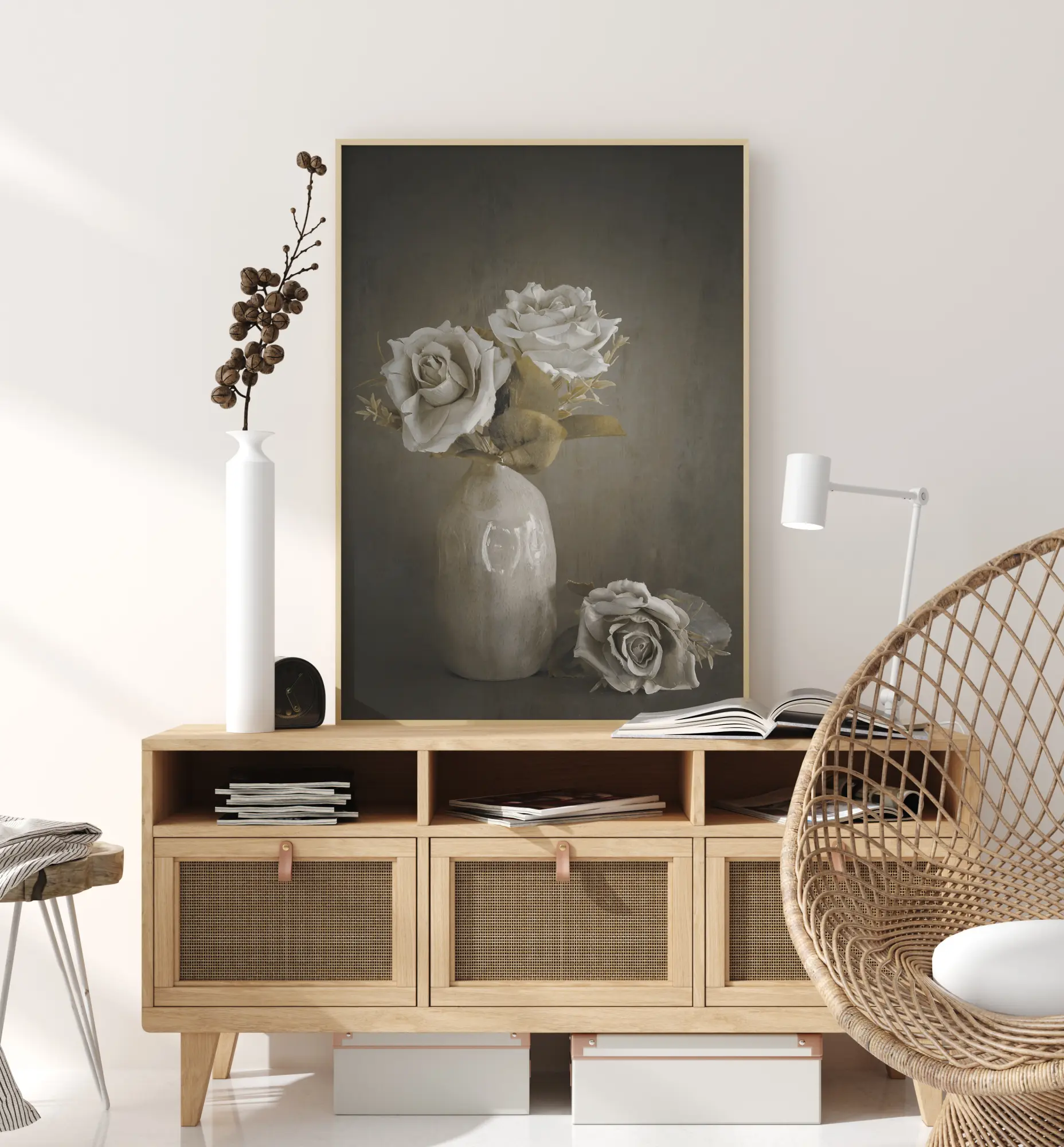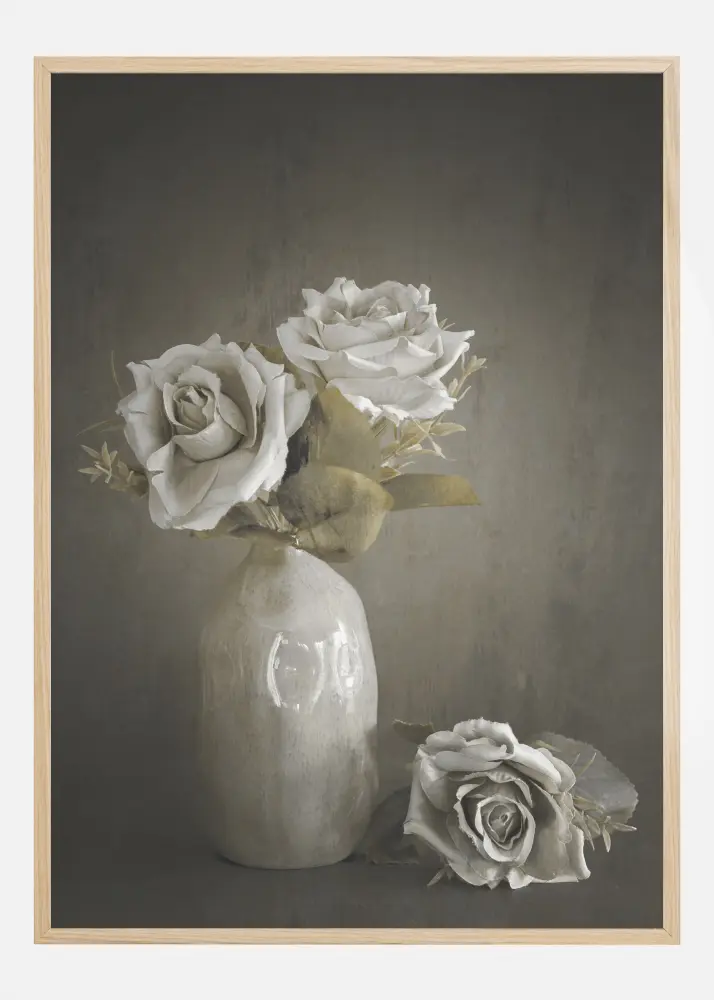 Um simples póster com rosas pintadas em um vaso. Duas rosas brancas estão em um vaso branco, uma terceira rosa está colocada na prateleira ao lado. Cada rosa brilha com uma luz invisível num fundo cinzento escuro suave, criando uma imagem elegante, mas ainda teatral.