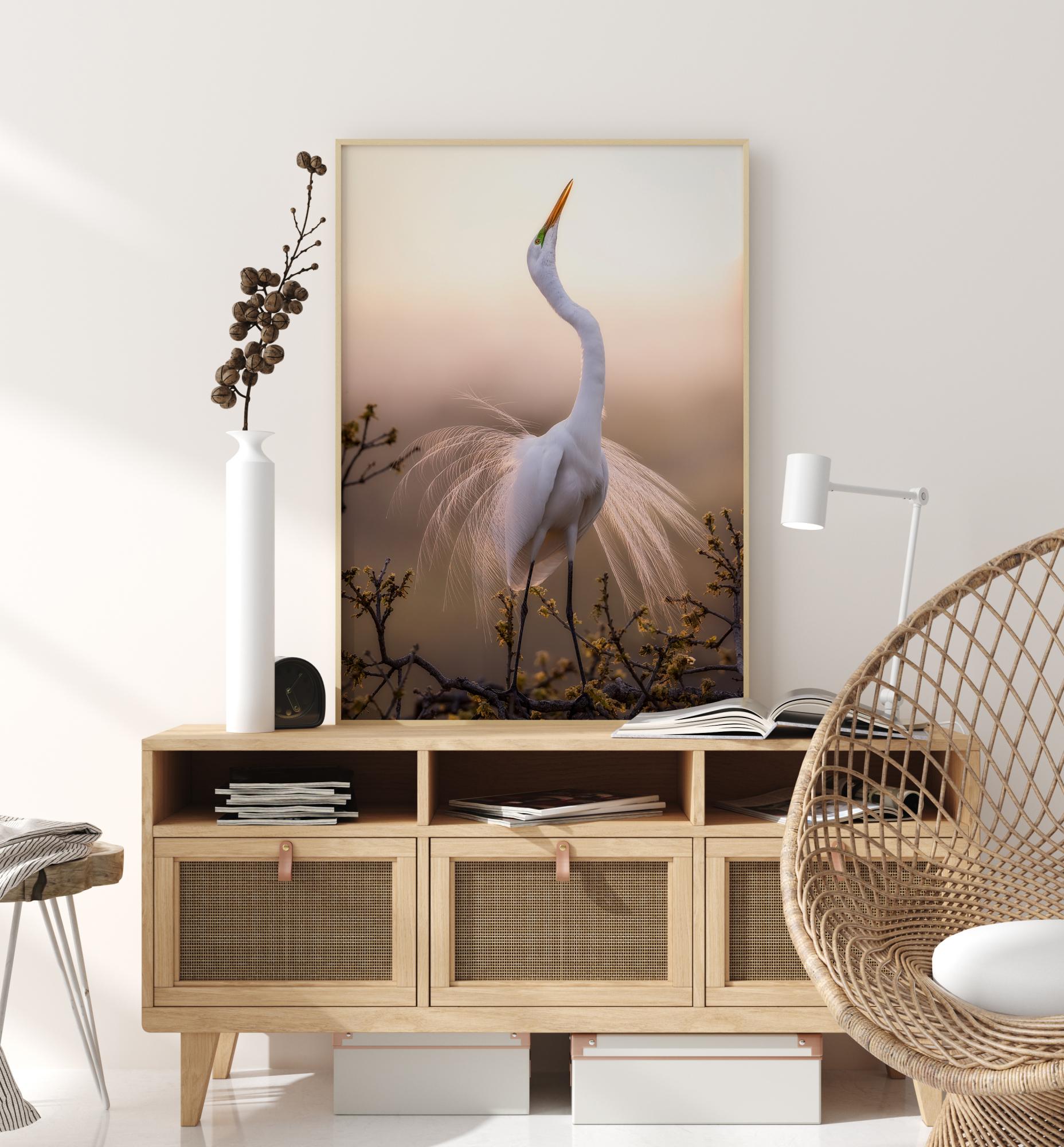 Um póster de animais com uma cegonha dançando na luz da manhã. O corpo branco e imponente da cegonha contra o pôr-do-sol suave que brilha das penas cria uma cena surreal. Acorde todas as manhãs com uma sensação de admiração com a ajuda desta impressão.