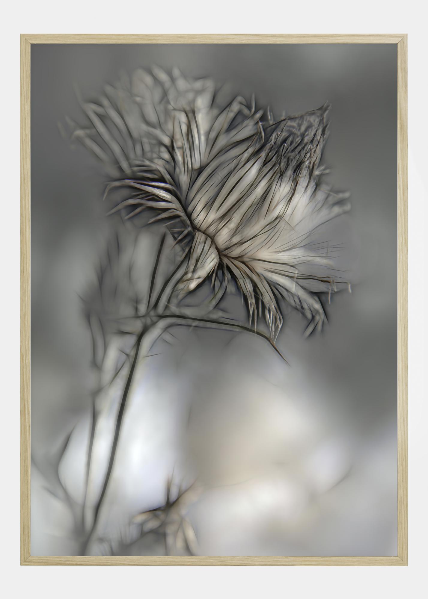 Um póster de close-up com uma cabeça de flor. Cores suaves de azul, cinzento e rosa preenchem a imagem enquanto a flor é nitidamente delimitada em relação ao fundo suave e borrado. Você quase pode estender a mão e pegar a flor desta imagem incrível e suave.