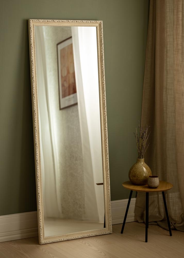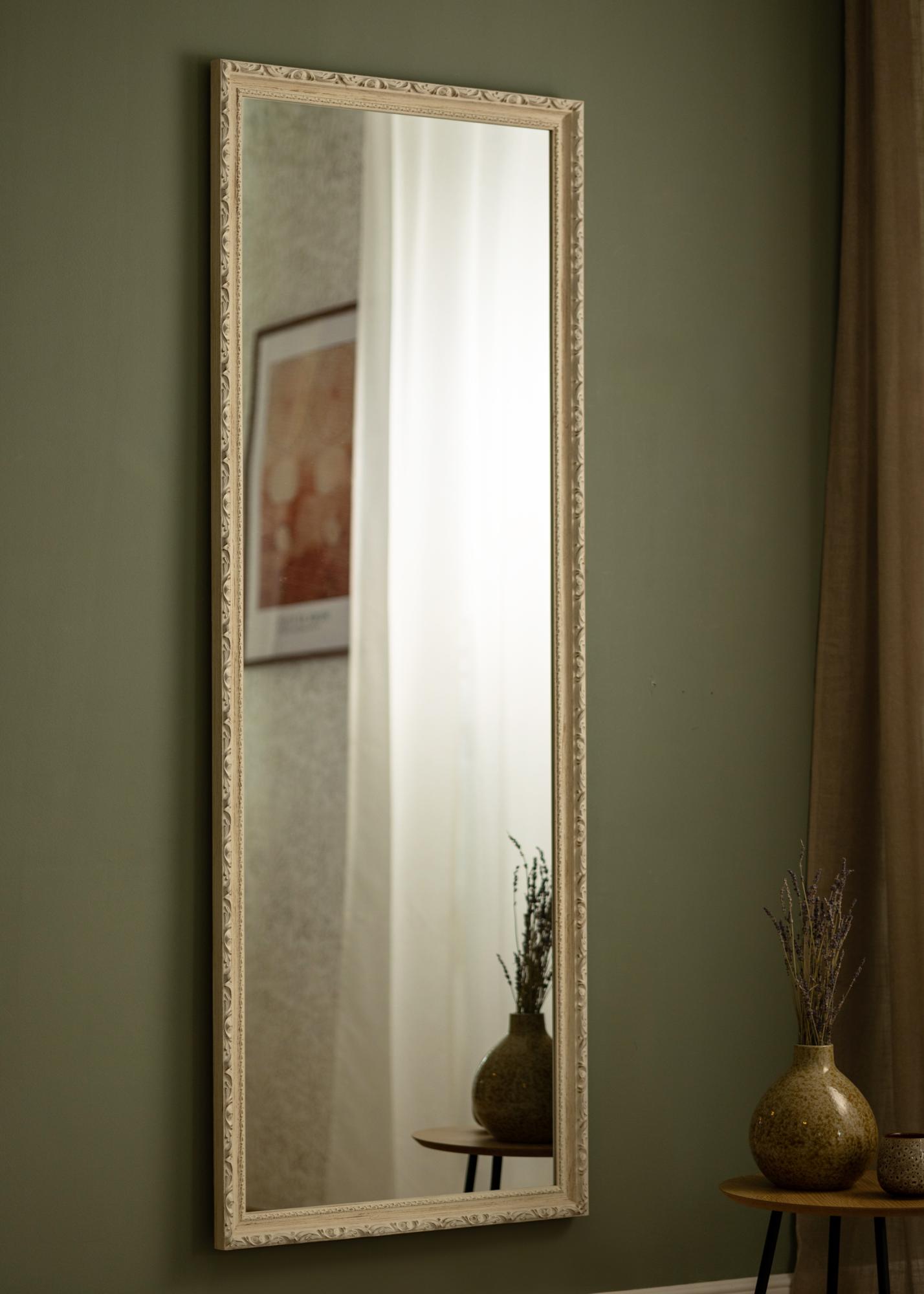 Espelho branco em estilo antigo com veios de madeira visíveis e uma largura de 40 mm. Uma excelente escolha quando procura um espelho que se destaca e ocupa espaço.