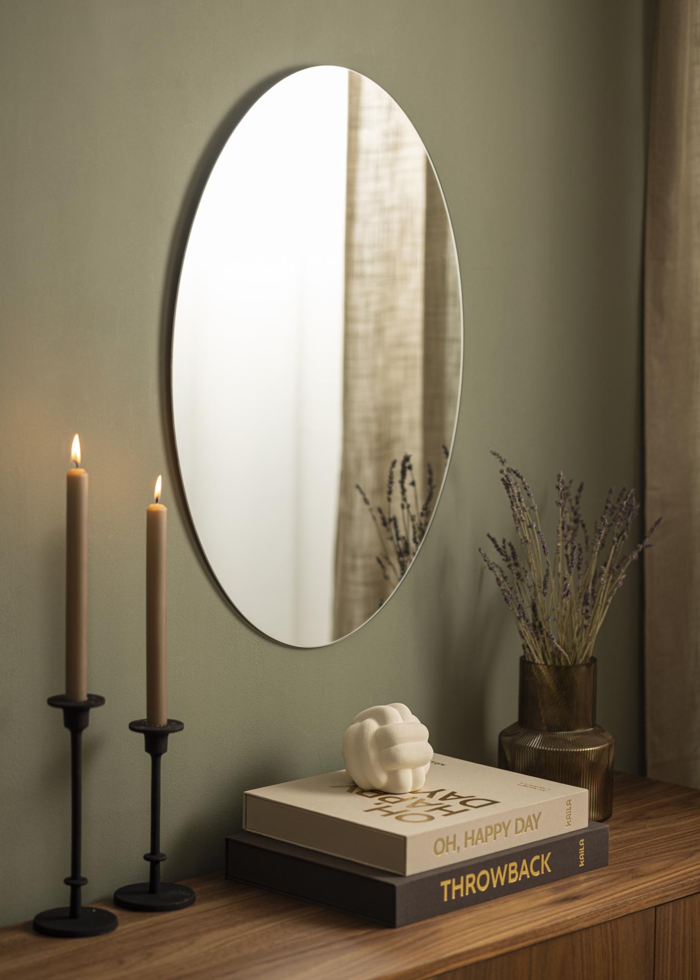 Iniciar o seletor de molduras »Espelho sem borda com forma oval. Detalhe de decoração perfeito para a sala de estar ou como um espelho mais pequeno para o hall.