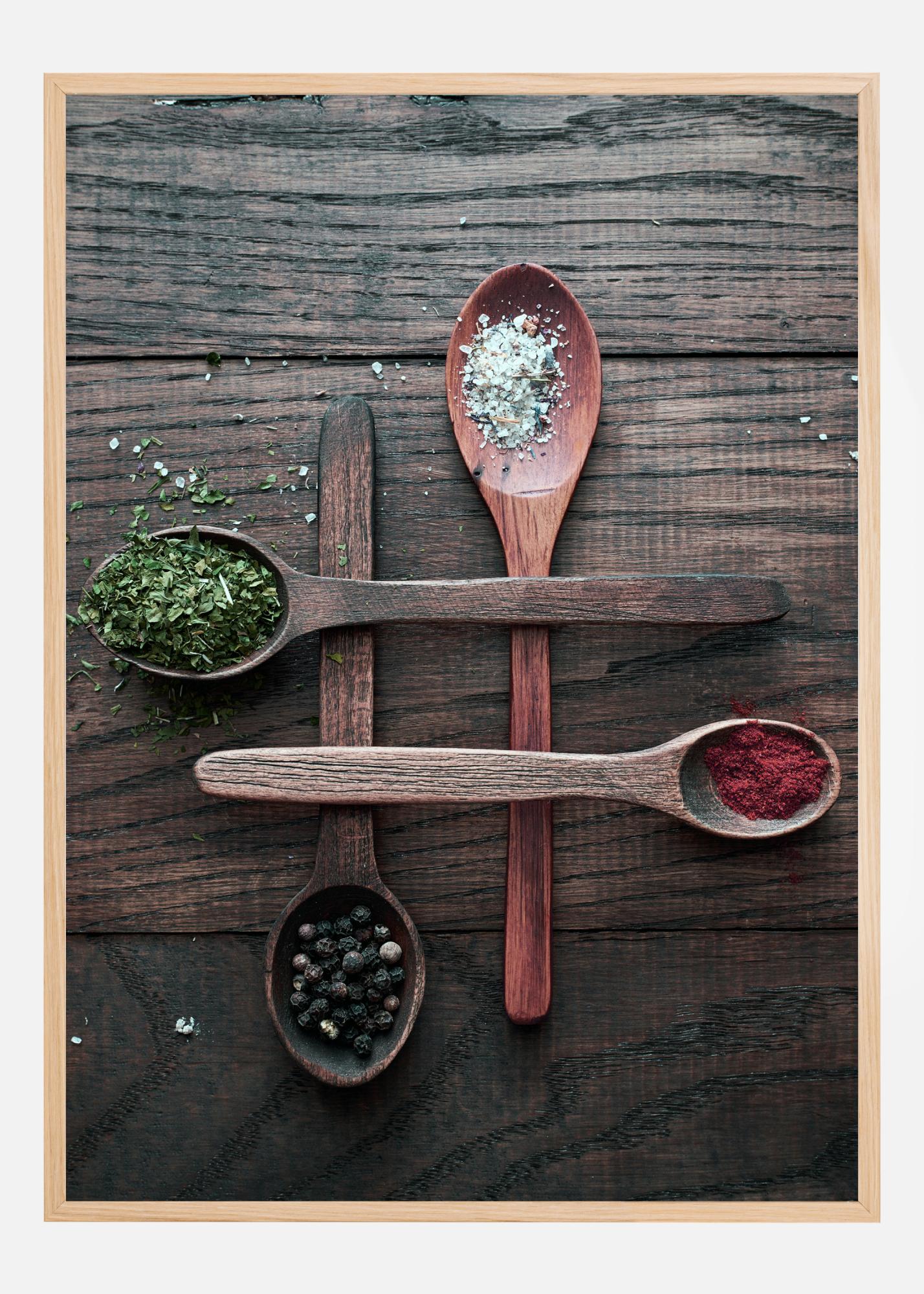 Um póster de natureza morta com quatro colheres de madeira, cada uma contendo uma especiaria. As quatro colheres se cruzam e formam uma grade em uma mesa de madeira rústica. Ervas e especiarias derramam de cada colher, criando uma atmosfera divertida para cozinhar, perfeita para inspirar sua cozinha.
