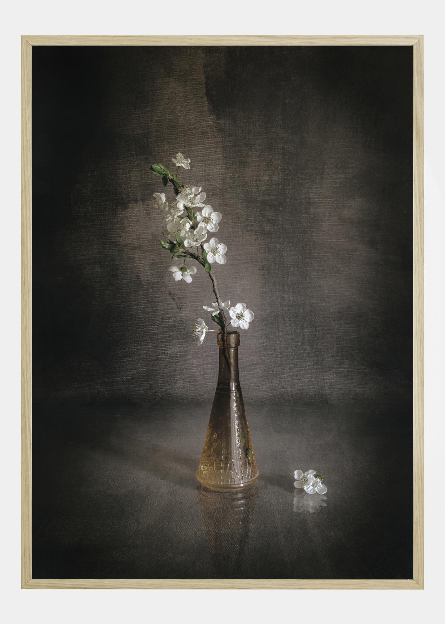 Um póster de primavera com flores brancas em um vaso marrom fino. O vaso lança sombras em duas direções e cria um ponto focal luminoso onde as flores em forma de estrela crescem em direção às pinceladas largas e escuras na parede atrás. Contemple esta elegante natureza morta.