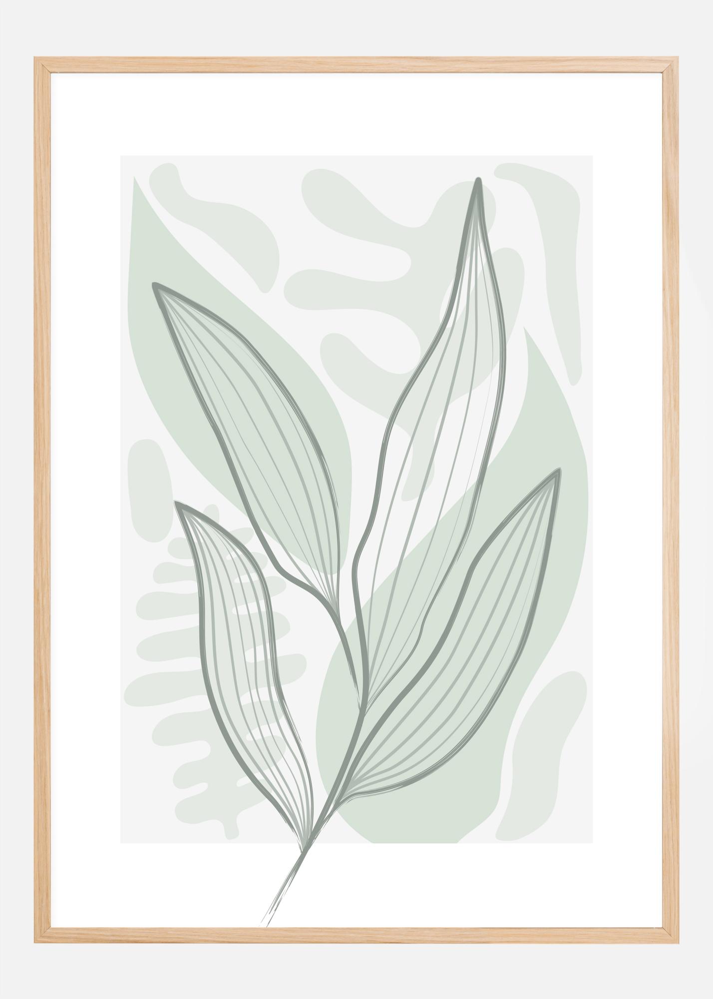 Um póster abstrato com folhas num fundo verde simples com diferentes formas e padrões de folhas. Com cores verdes e cinzentos suaves, o design simples de folhas, delimitado por uma linha cinzento forte, proporciona uma sensação de primavera forte, mas suave, que pode ser pendurada em qualquer divisão da casa.