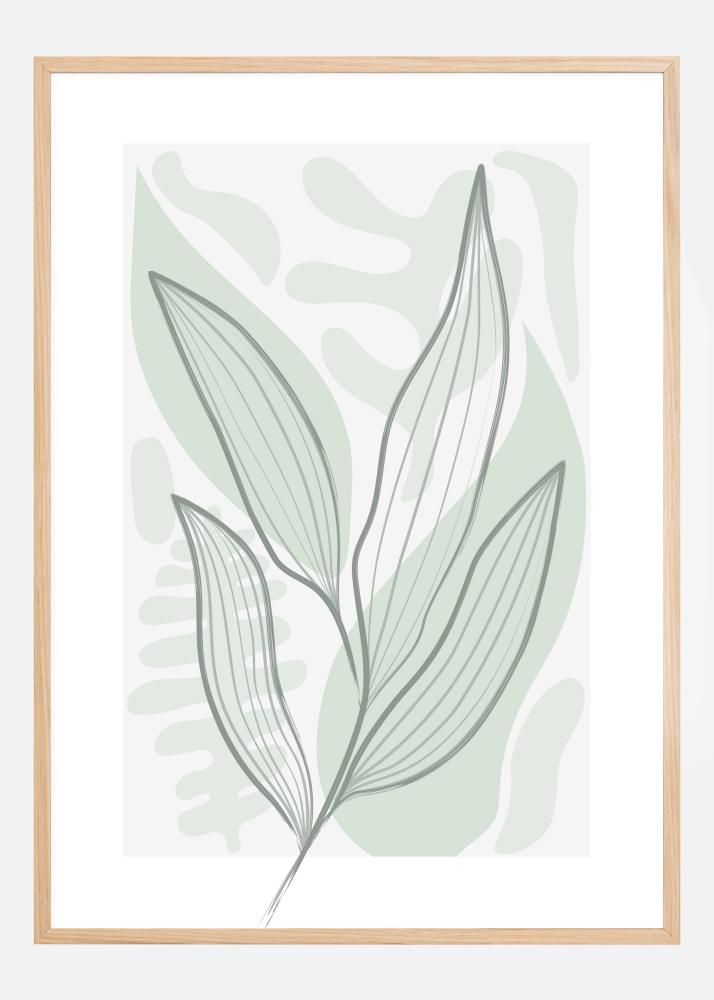 Um póster abstrato com folhas num fundo verde simples com diferentes formas e padrões de folhas. Com cores verdes e cinzentos suaves, o design simples de folhas, delimitado por uma linha cinzento forte, proporciona uma sensação de primavera forte, mas suave, que pode ser pendurada em qualquer divisão da casa.