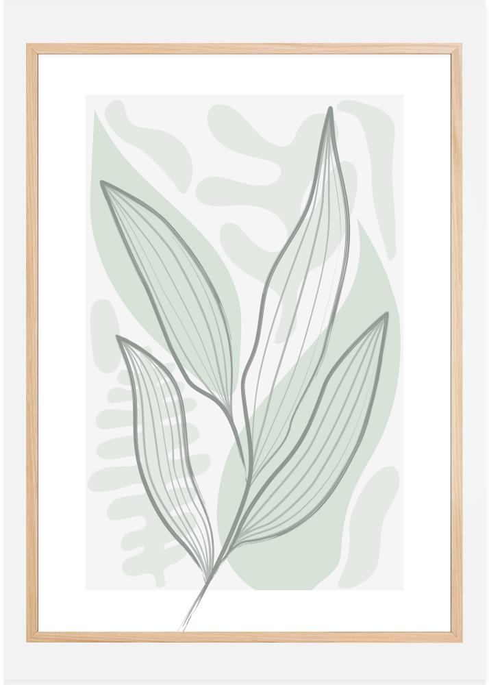 Um póster abstrato com folhas num fundo verde simples com diferentes formas e padrões de folhas. Com cores verdes e cinzentos suaves, o design simples de folhas, delimitado por uma linha cinzento forte, proporciona uma sensação de primavera forte, mas suave, que pode ser pendurada em qualquer divisão da casa.