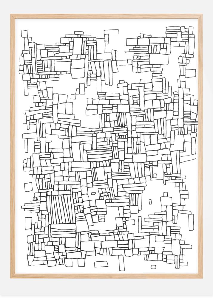 Um padrão de quadrados geométricos em linhas pretas num fundo branco. Centenas de pequenos quadrados e retângulos são combinados para criar um padrão estranho em toda a imagem. Olhe para ele e tente encontrar os padrões e formas quando tiver essa obra de arte falante pendurada em casa.