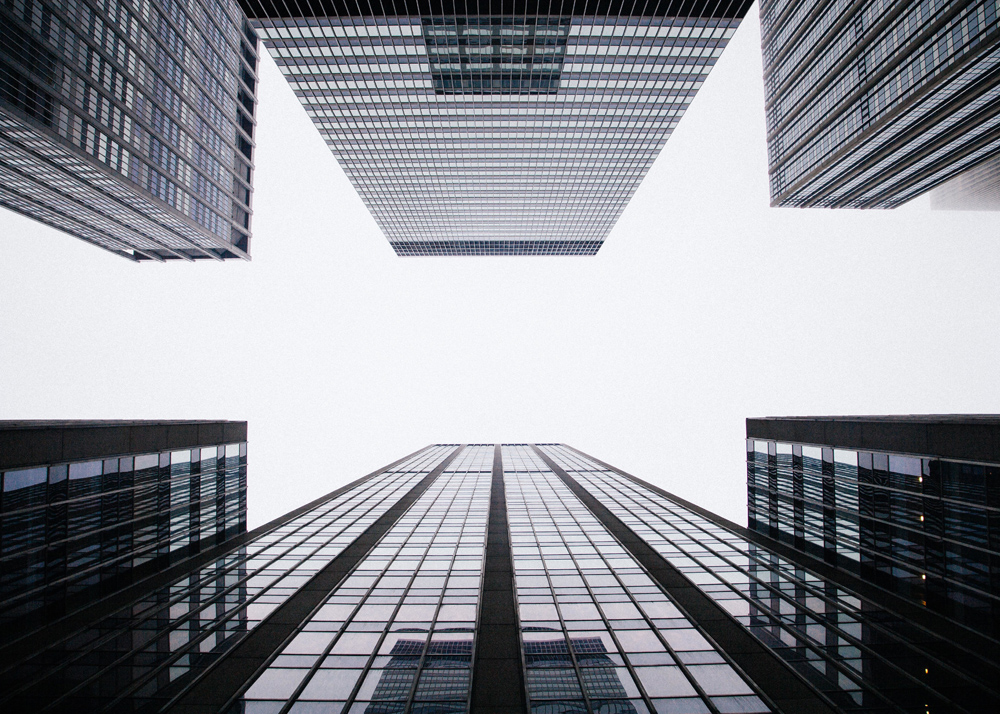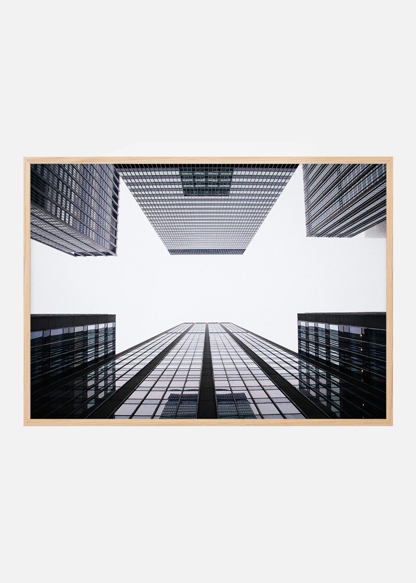 Cartaz de arquitetura com arranha-céus em crescimento contra um céu branco de nuvens. Imagem elegante de edifícios escuros num fundo branco, com reflexos do céu nas janelas de vidro. Presente perfeito para quem gosta de retratos gráficos de construções. A impressão fica ótima numa moldura preta que realça a escuridão da imagem e fica bonita em combinação com outras fotografias de arquitetura.
