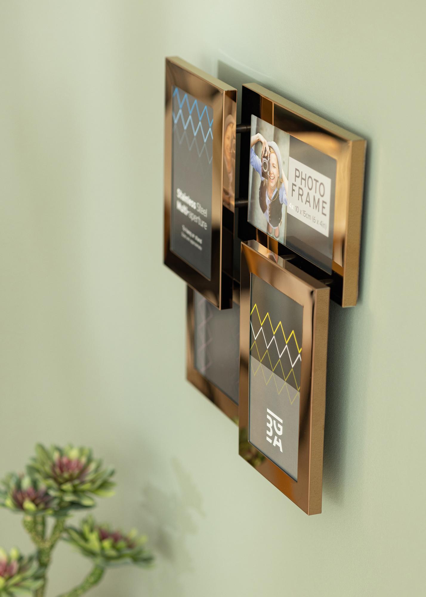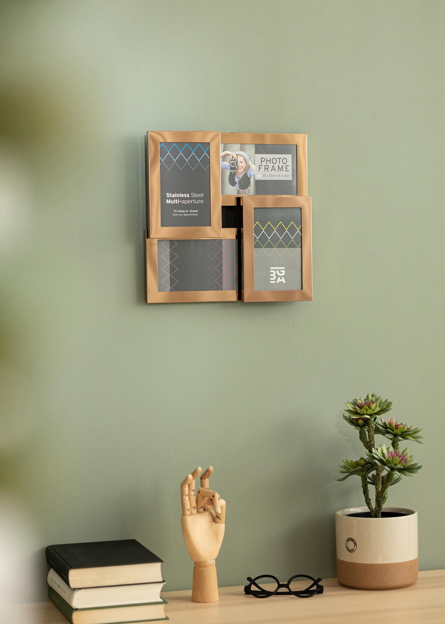 Este colar de colagem dará a quatro das suas fotos uma moldura elegante. A moldura é adequada para duas fotos no formato retrato e duas fotos no formato paisagem, todas no tamanho 10x15 cm. Pode ser pendurada na parede, mas também se encaixa perfeitamente numa mesa ou criado-mudo.