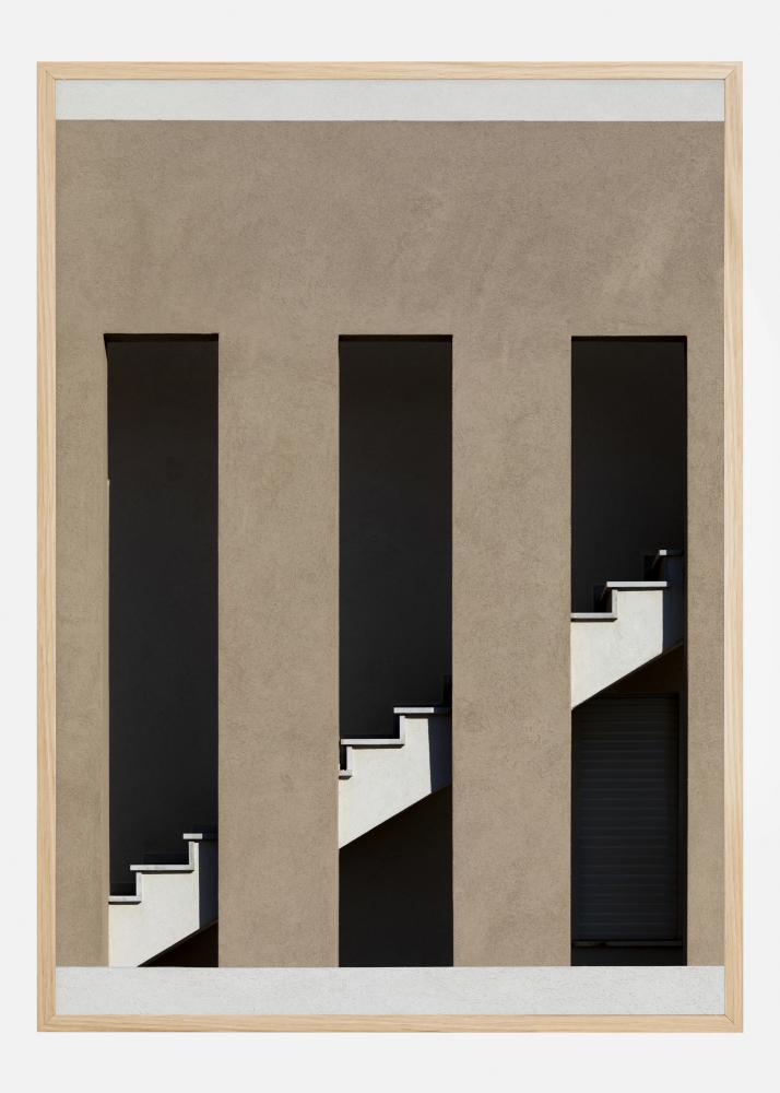 Um póster em ambiente urbano com escadas subindo atrás de grandes aberturas de janelas. Uma imagem abstrata fantástica, onde as formas geométricas criam uma sensação de ordem nesta imagem dramática. Esta imagem dá ao seu lar um toque de arte.