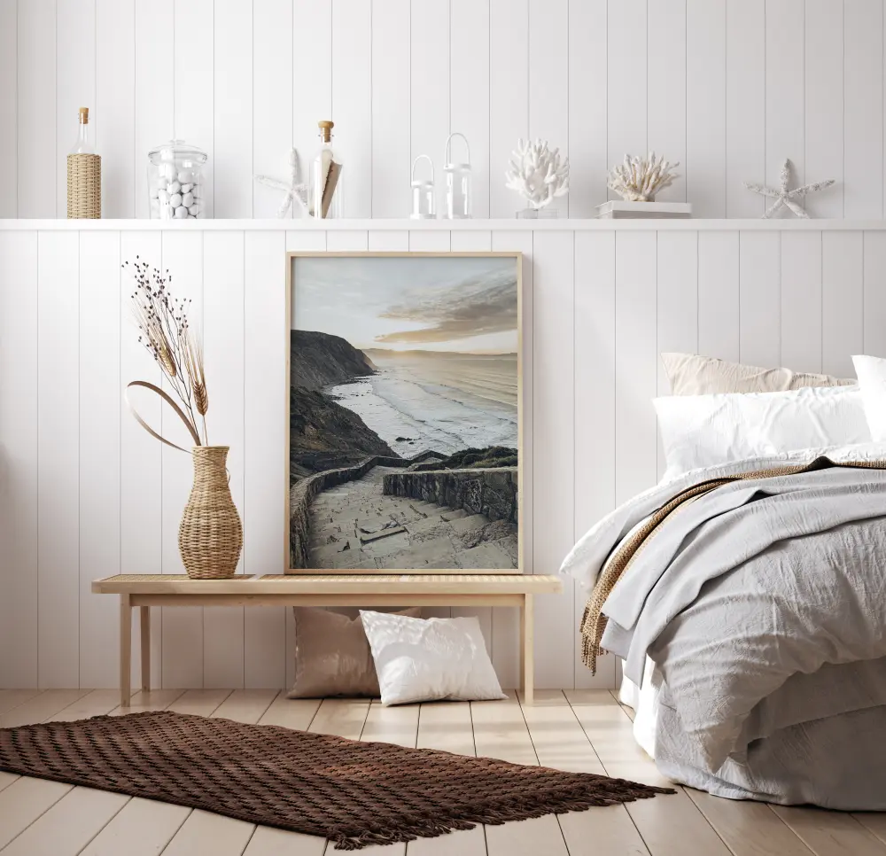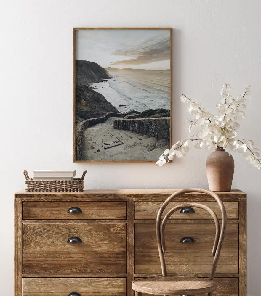 Um belo cartaz de paisagem com uma vista panorâmica do mar e uma praia. Grandes escadarias de pedra descem o penhasco em direção à praia, que reflete a forma do promontório ao longe. As ondas batem na praia rochosa nesta imagem suave em tons pastel.