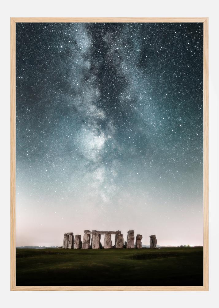 Uma famosa marco histórico com Stonehenge contra um llamativo céu noturno estrelado. Esta imagem ampla foca na dramática Via Láctea que atravessa o céu azul cheio de estrelas. Siga a galáxia para baixo até ver Stonehenge como uma pequena formação de pedras no canto inferior da imagem para ter uma visão diferente desta impressionante maravilha mundial.