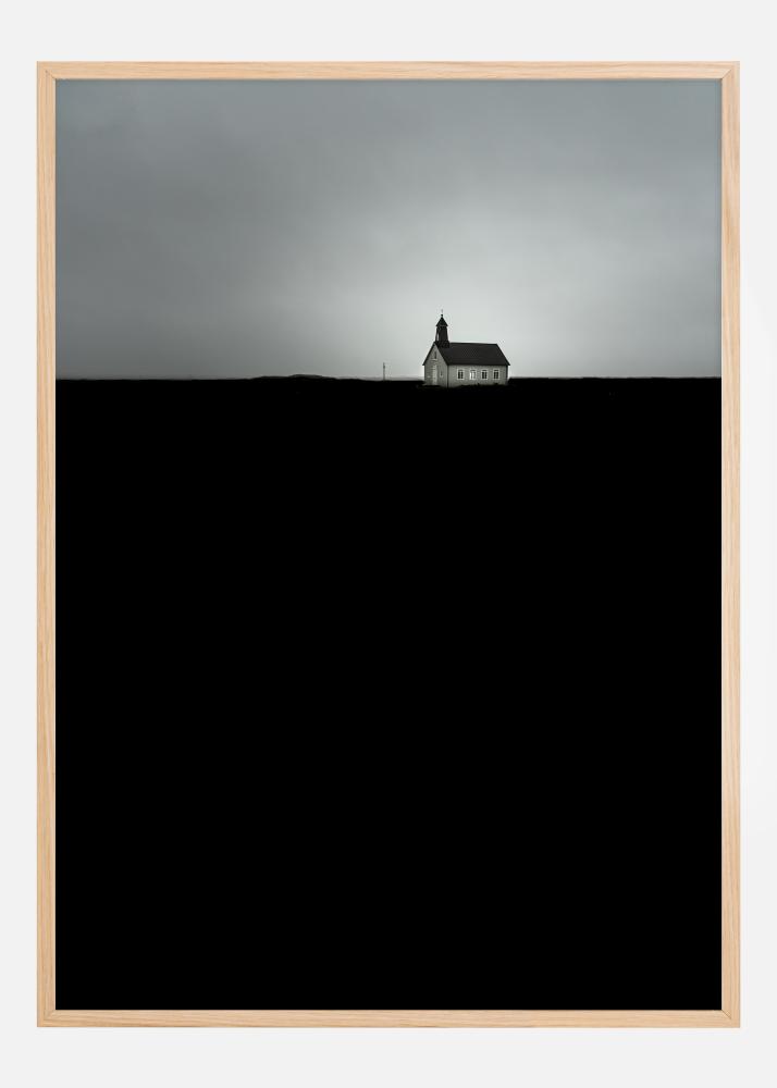 Este cartaz proporciona uma imagem forte e evocativa de Strandarkirkja, uma igreja solitária que se ergue contra um céu dramático. A silhueta escura da paisagem cria um contraste acentuado com o céu cinzento, oferecendo uma sensação de isolamento e tranquilidade. As paredes brancas da igreja brilham no cenário, oferecendo um símbolo de esperança e orientação na escuridão circundante.