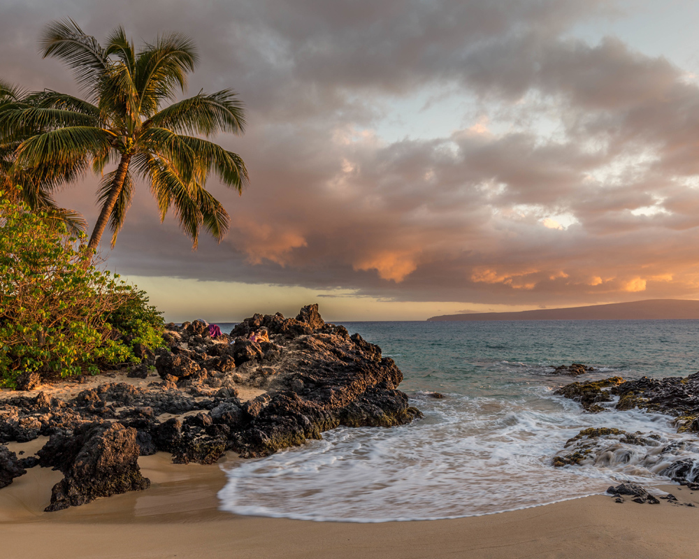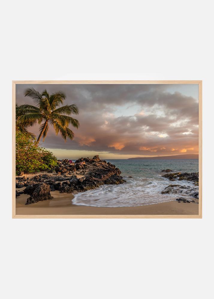 Uma praia ao pôr-do-sol, um clichê bonito que é obrigatório para os amantes de tiki ou tema tropical. póster com a palmeira clássica inclinada sobre a beira da praia nos últimos raios dourados do dia. A fotografia fica bonita numa moldura com aparência desgastada pelo tempo ou numa cor forte para combinar com a decoração tiki.
