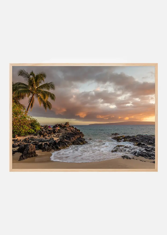 Uma praia ao pôr-do-sol, um clichê bonito que é obrigatório para os amantes de tiki ou tema tropical. póster com a palmeira clássica inclinada sobre a beira da praia nos últimos raios dourados do dia. A fotografia fica bonita numa moldura com aparência desgastada pelo tempo ou numa cor forte para combinar com a decoração tiki.
