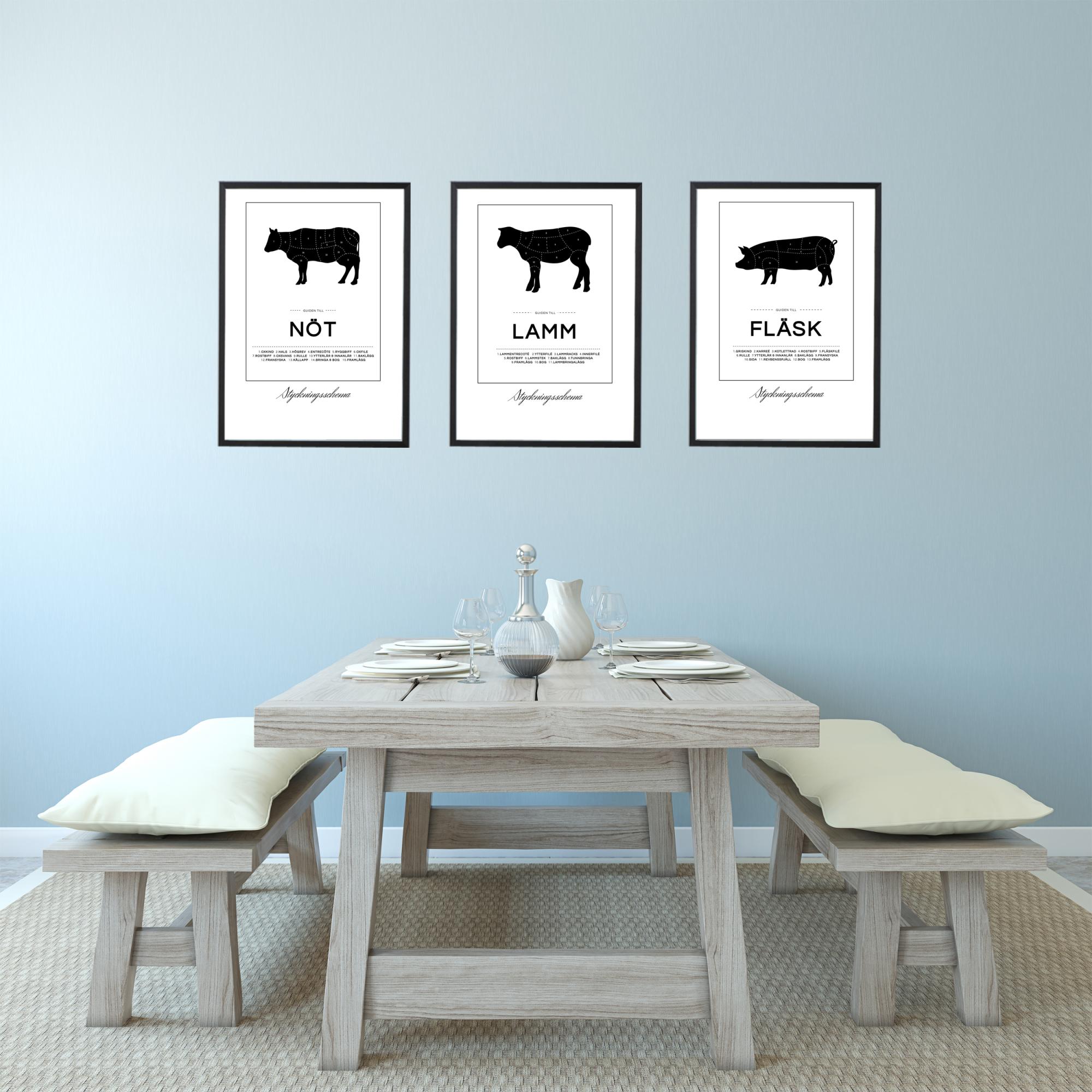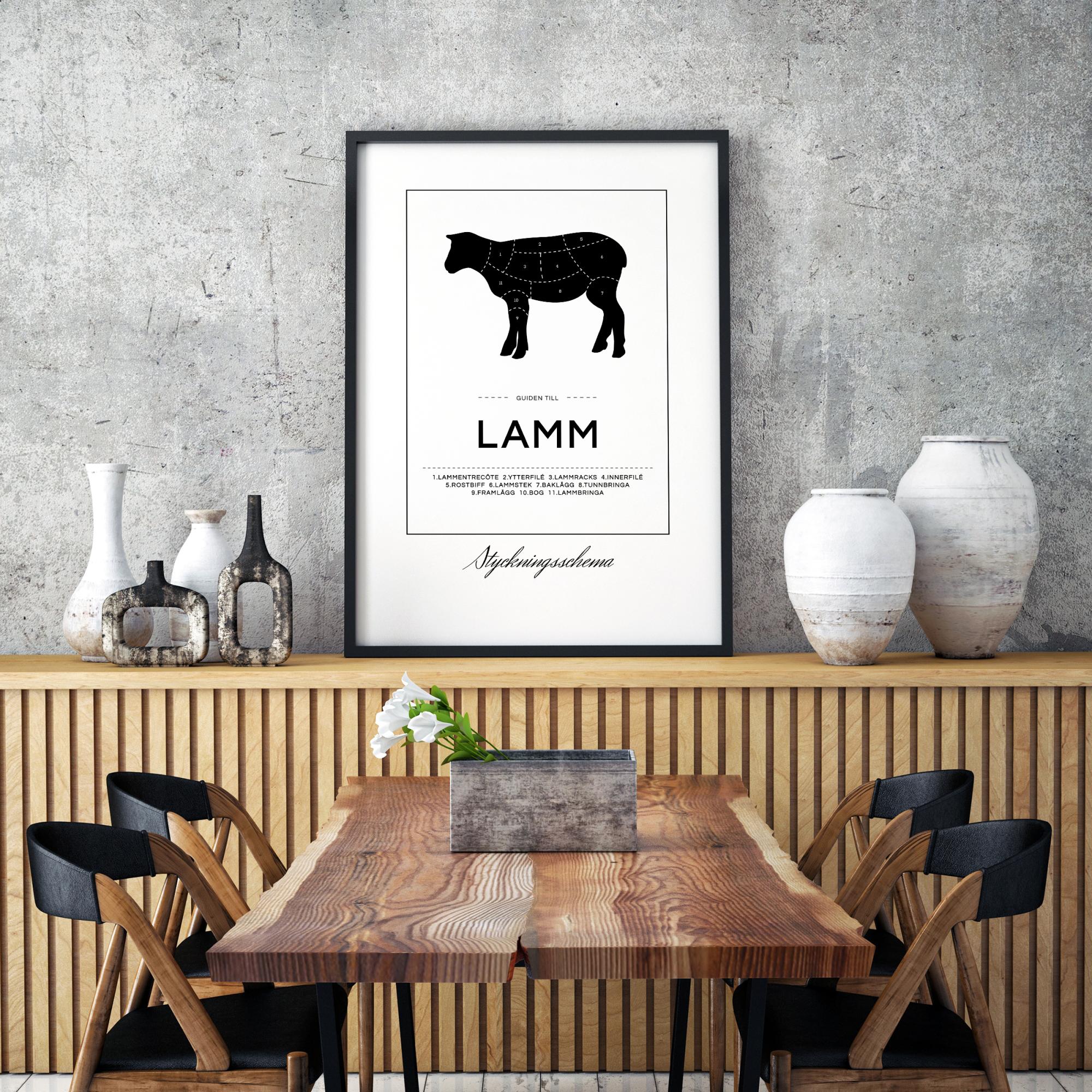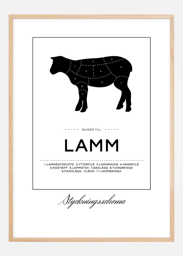 Aprenda onde encontrar todas as delícias de cordeiro com este elegante póster na parede. O póster retrata um cordeiro preto dividido em marcações que mostram onde encontrar, por exemplo, filé de cordeiro, costeletas de cordeiro e paleta. Como complemento à imagem, o texto "Guia de cordeiro" está acompanhado de uma lista numérica organizada das diferentes partes. Em torno do texto e da imagem, há um retângulo fino e abaixo do retângulo há uma impressão com o texto "Esquema de corte".