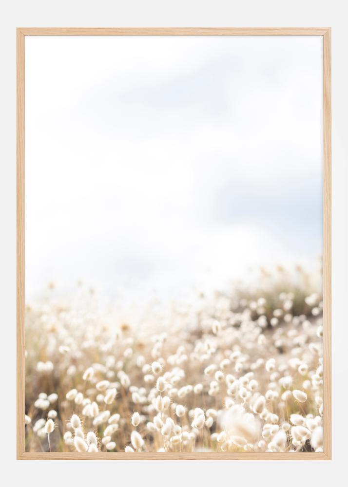 Este pôster onírico captura um campo cheio de flores leves e fofas que banham-se em uma luz solar suave. O motivo, repleto de natureza e tranquilidade, transmite uma sensação de calor e calma. As delicadas cabeças das flores brancas balançam na brisa suave, e a imagem está envolta em tons pastéis de amarelo, bege e branco que se fundem com o céu azul claro.