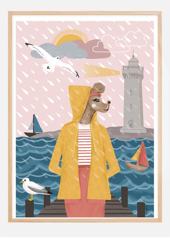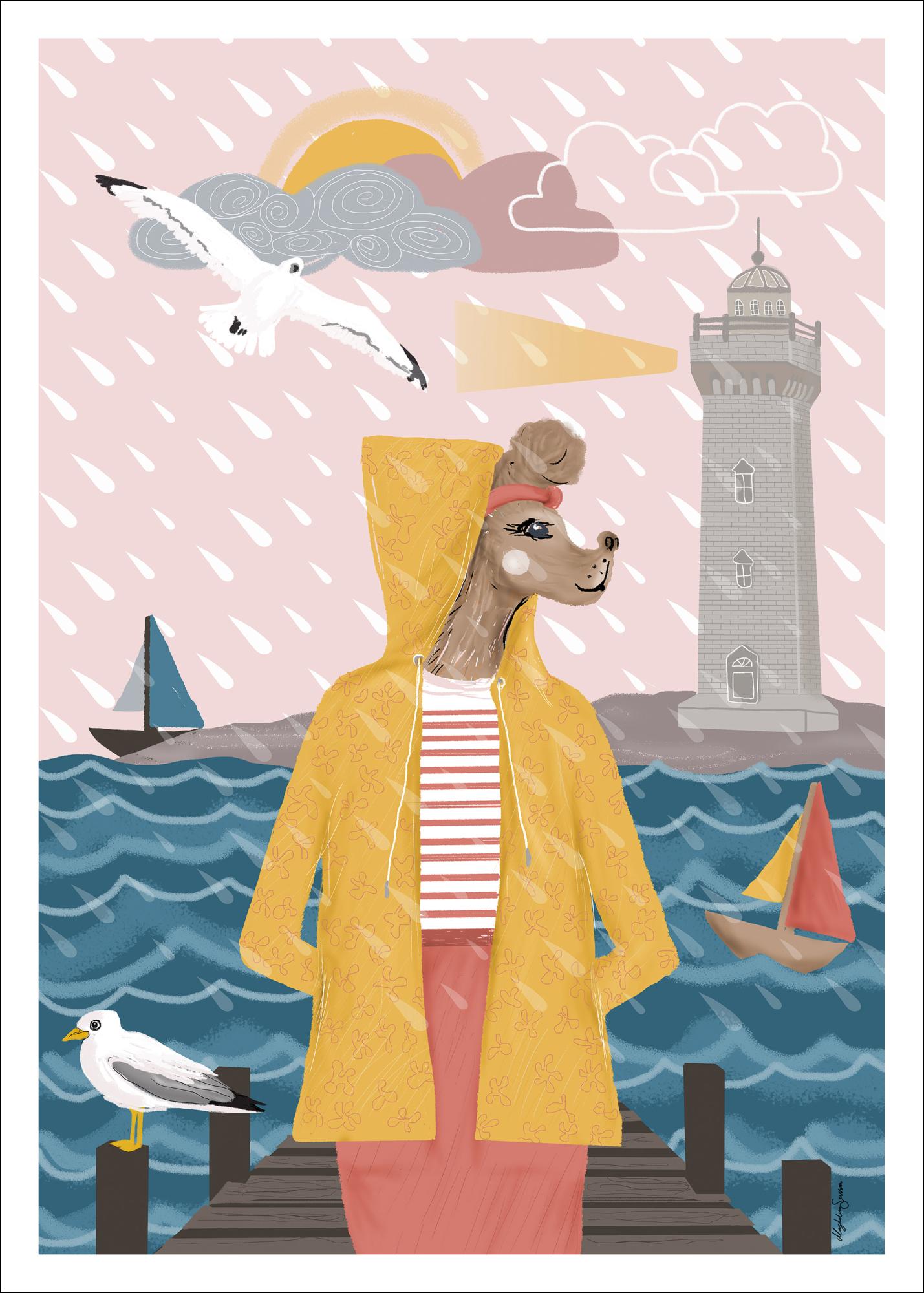 Um póster no estilo de recortes com um poodle adorável vestido com um casaco amarelo na chuva. Ela está em um cais na frente de pequenas ondas azuis quebrando. Um farol está ao fundo, dois barcos passam flutuando e uma gaivota voa por cima. O sol está aparecendo entre as nuvens e está pronto para secar tudo nesta imagem divertida no estilo de um livro de contos de fadas.