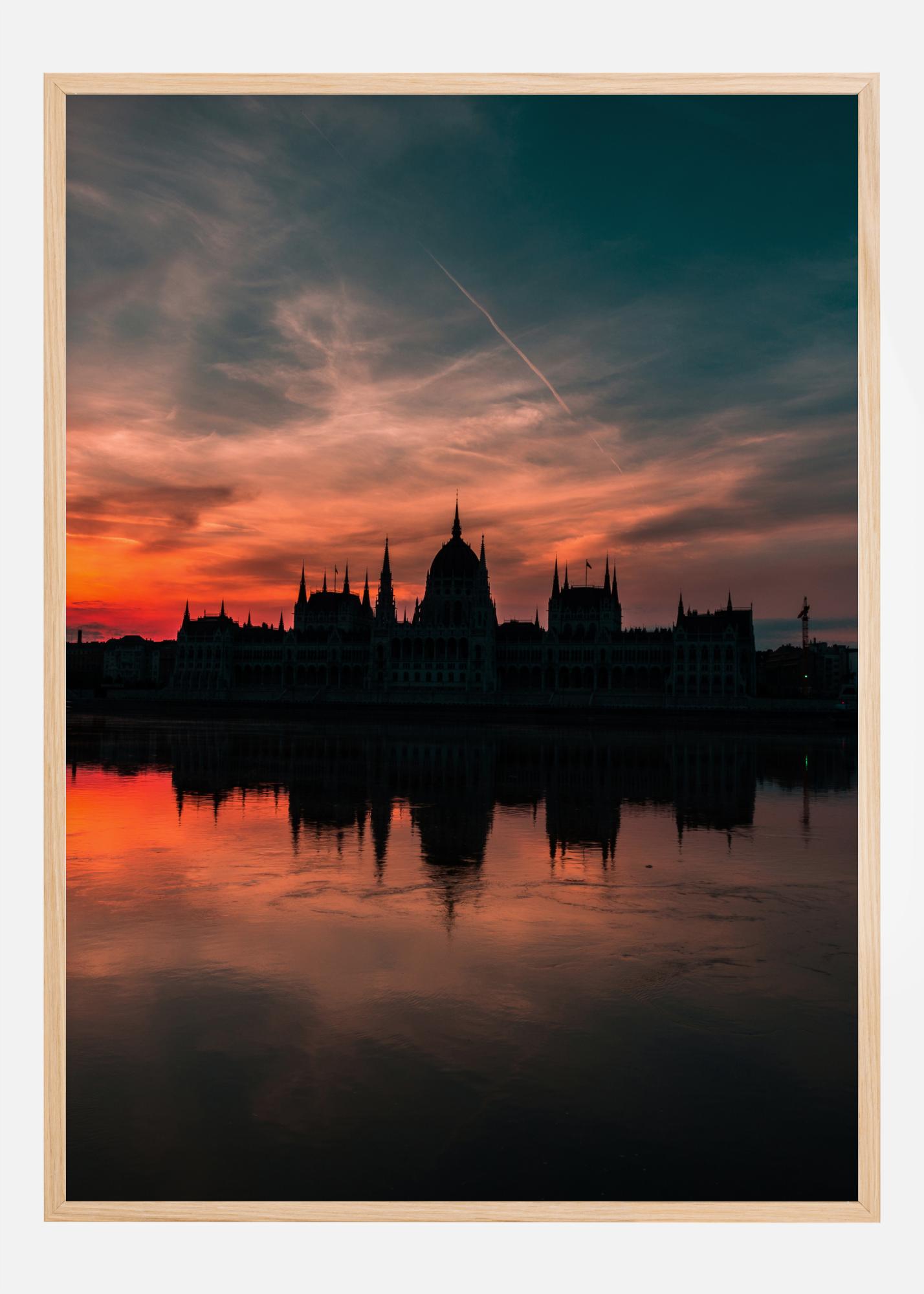 Uma postagem de pôr-do-sol com uma cidade com vista para uma grande massa de água. A silhueta preta forte das torres da cidade reflete na água. Ao fundo, um incrível pôr-do-sol vermelho ilumina o céu e lança uma iluminação dramática sobre a água e a cidade.