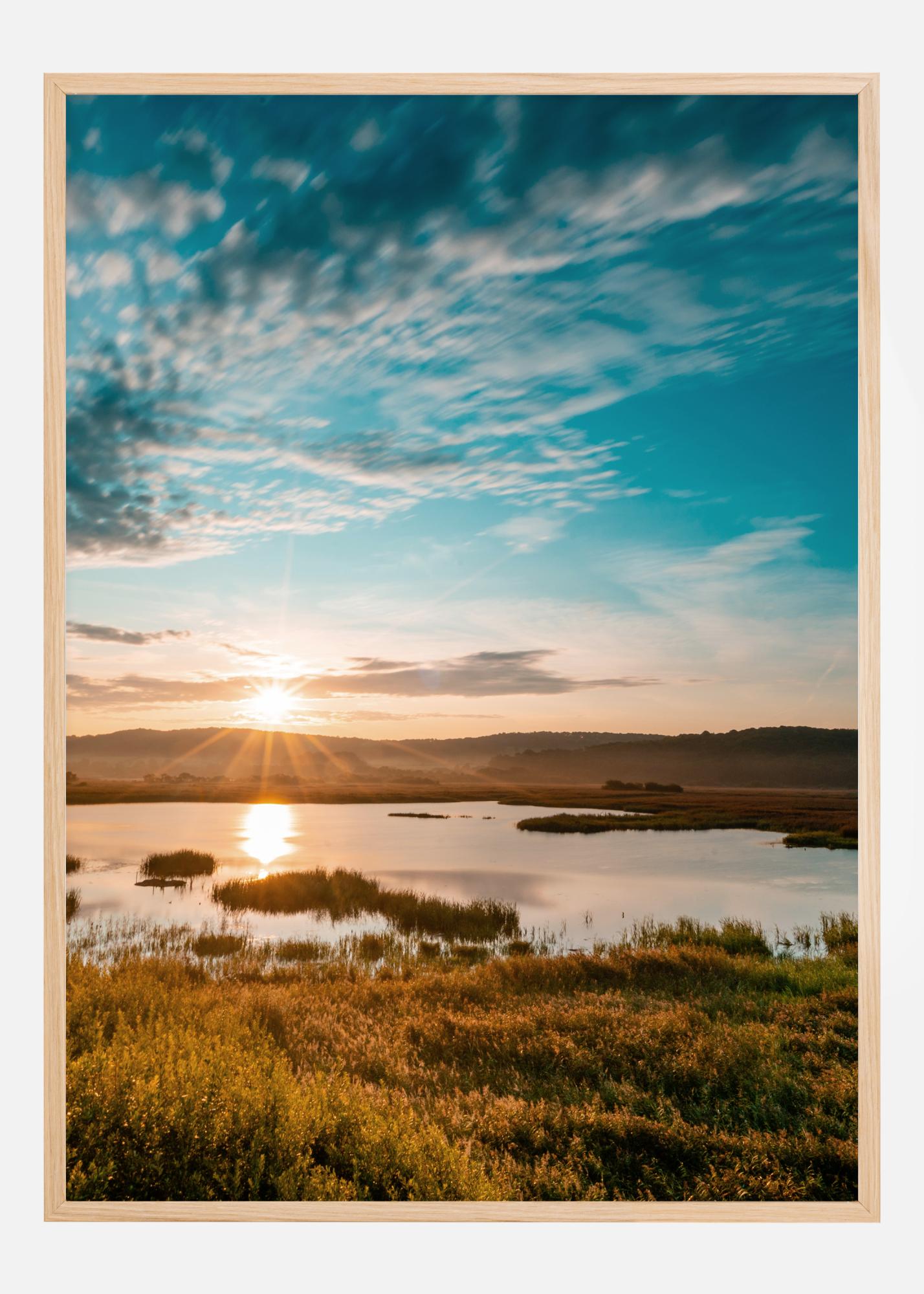 Um póster épico com um pôr-do-sol sobre a água. As ondas do mar batem na praia plana e rochosa. Nuvens escuras estão diretamente acima, com um pôr-do-sol vermelho brilhante baixo no horizonte, criando uma imagem dramática e impressionante que vai manter o seu foco.