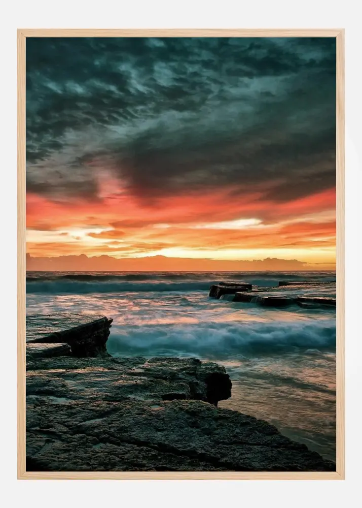 Um póster épico com um pôr-do-sol sobre a água. As ondas do mar batem na praia plana e rochosa. Nuvens escuras estão diretamente acima, com um pôr-do-sol vermelho brilhante baixo no horizonte, criando uma imagem dramática e impressionante que vai manter o seu foco.