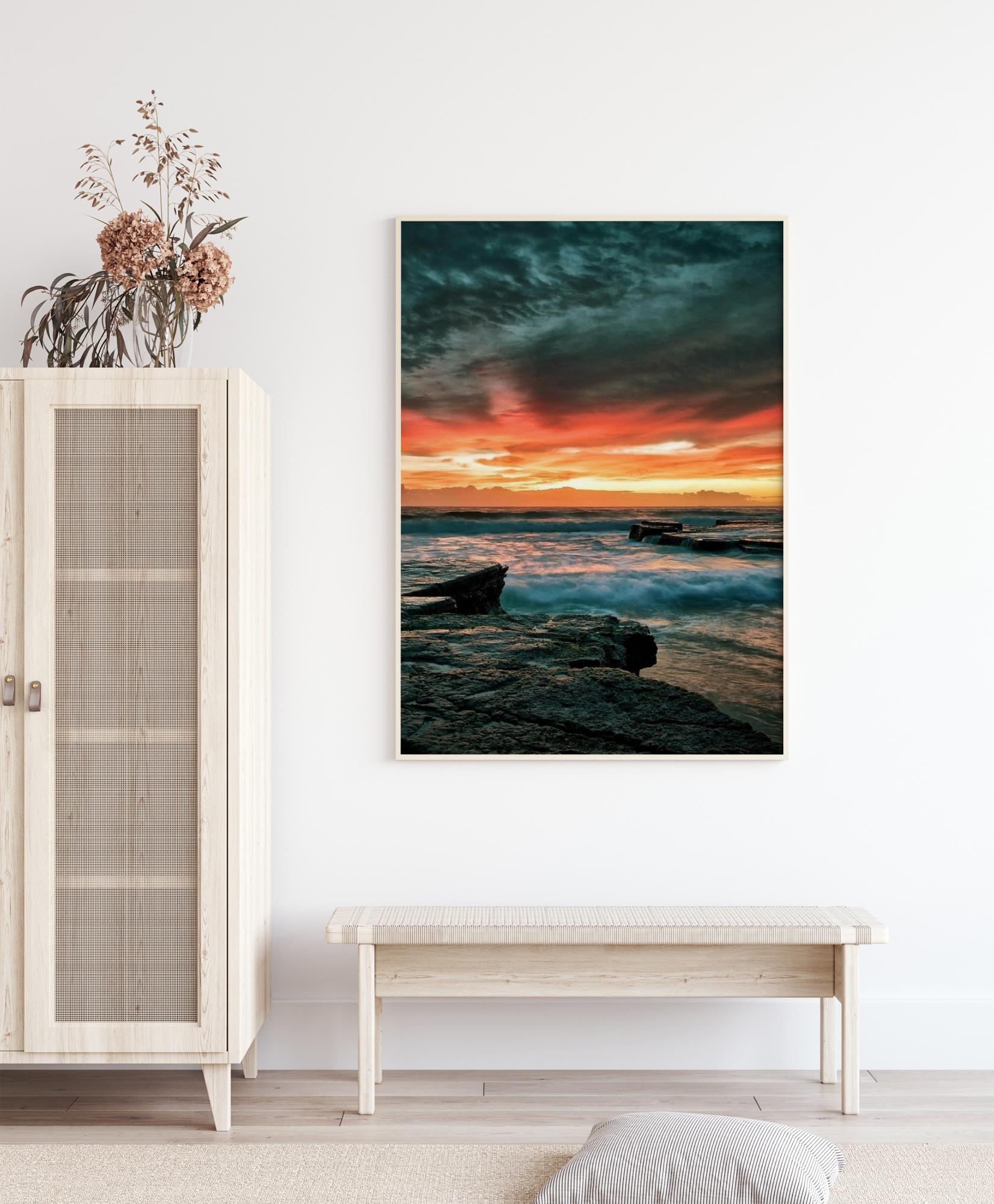 Um póster épico com um pôr-do-sol sobre a água. As ondas do mar batem na praia plana e rochosa. Nuvens escuras estão diretamente acima, com um pôr-do-sol vermelho brilhante baixo no horizonte, criando uma imagem dramática e impressionante que vai manter o seu foco.