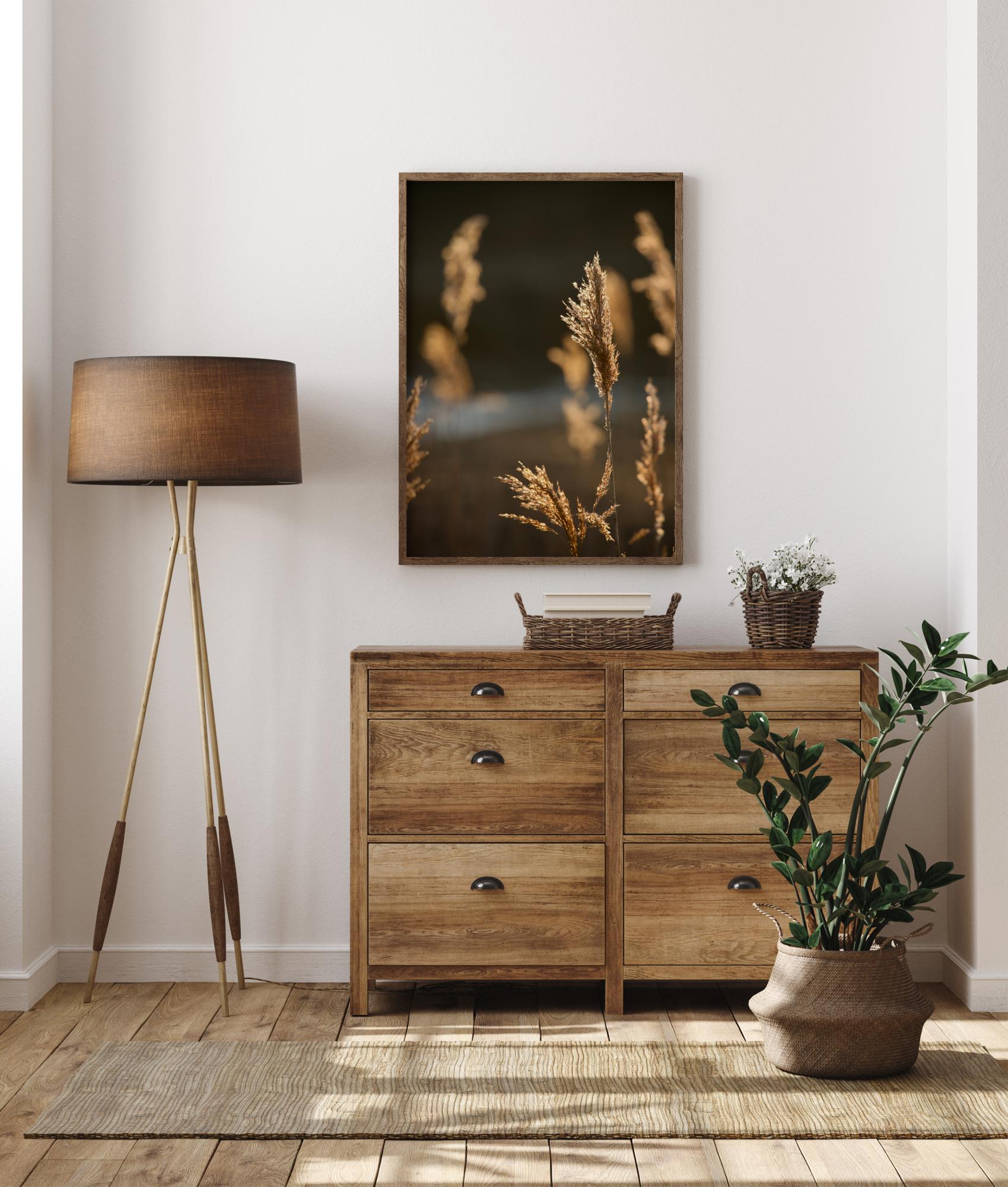 Um póster de verão com sol brilhando em um campo. Close-up de fios de grama balançando em uma brisa de verão. Eles capturam a luz dourada do sol, que também brilha no rio distante. Desfrute desta imagem envolvente e suave que traz o verão para sua casa quando a pendura.