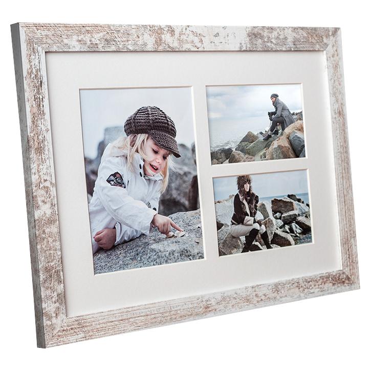 Bonito quadro vintage com um perfil de moldura larga e um aspecto gasto em branco e madeira. Dá uma dimensão extra às suas fotos e é perfeito quando quer ter uma sensação genuína de vintage. A moldura de colagem tem espaço para 3 fotos de tamanhos diferentes.