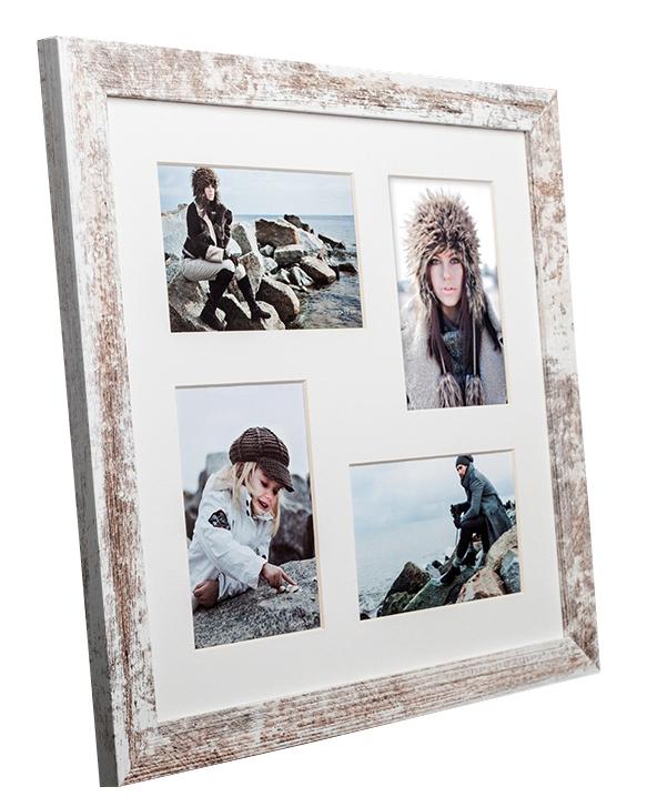 Bonito quadro vintage com um perfil de moldura largo e um aspecto gasto em branco e madeira. Adiciona uma dimensão extra às suas imagens e é perfeito quando quer ter uma sensação genuína de vintage. A moldura de colagem tem espaço para 4 fotos de 10x15 cm.
