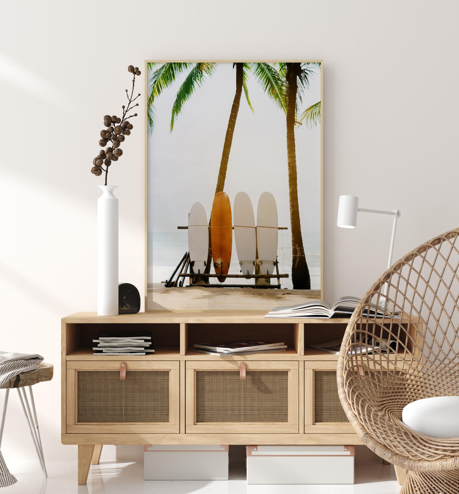 Um póster de verão com uma sensação boa, com pranchas de surfe, palmeiras e areia branca. Uma imagem exótica e agradável em cores vívidos e contrastes elegantes. Combine com outros das nossas belas imagens para criar uma galeria de parede maior e mais vívido.
