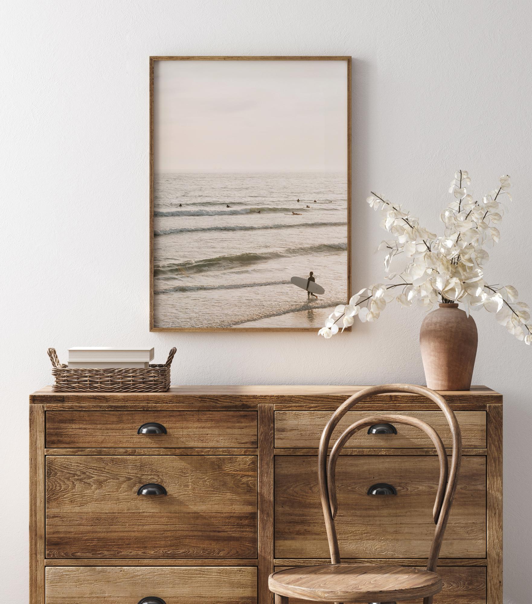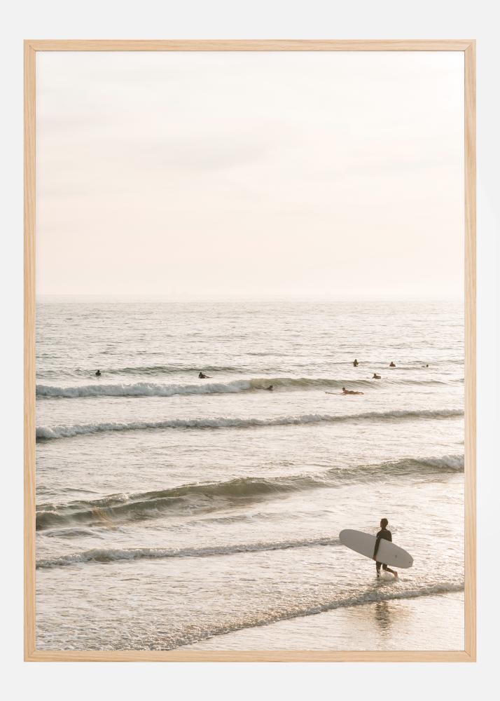 Um póster com um mar vasto cheio de surfistas esperando pela próxima grande onda. Pequenas cabeças flutuam longe no mar e um último surfista caminha entre as ondas com a sua prancha. O mar está calmo na suave luz da manhã e há uma sensação de expectativa no ar.
