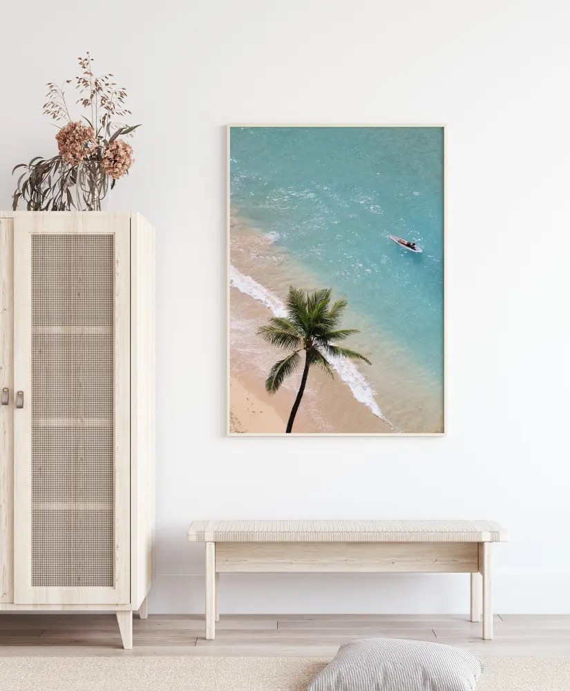Um póster relaxante com uma imagem aérea do mar e da praia. Uma palmeira se ergue à esquerda para realçar a cena da praia. Um surfista solitário está deitado em uma prancha de surfe no meio do mar azul claro. Perca-se neste paraíso insular.