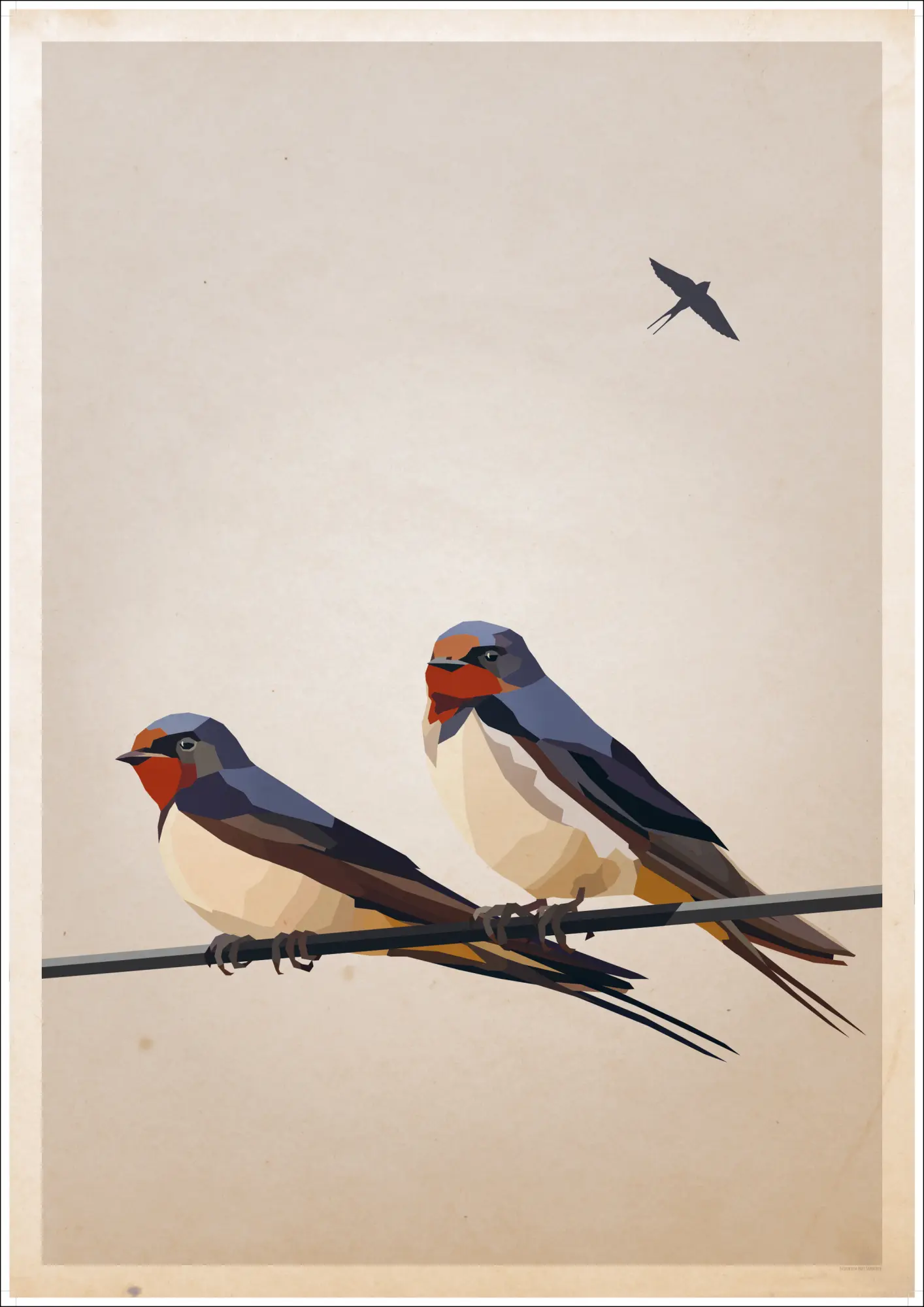 Um póster de animais com três andorinhas desenhadas com campos de cor. Dois pássaros de bochechas vermelhas estão sentados em um único fio esticado na parte inferior da imagem. Um terceiro pássaro voa para longe. As cores claras de azul e vermelho das andorinhas ficarão ótimas numa parede neutra simples em casa.