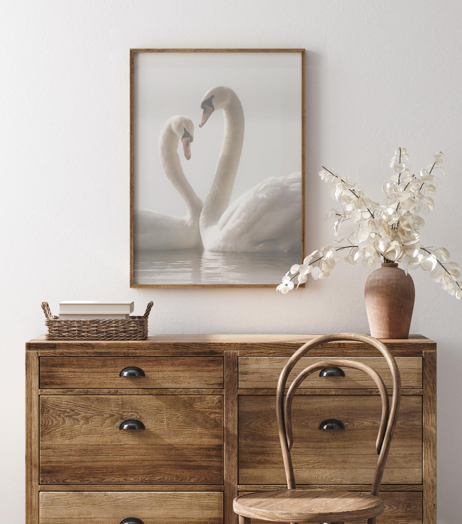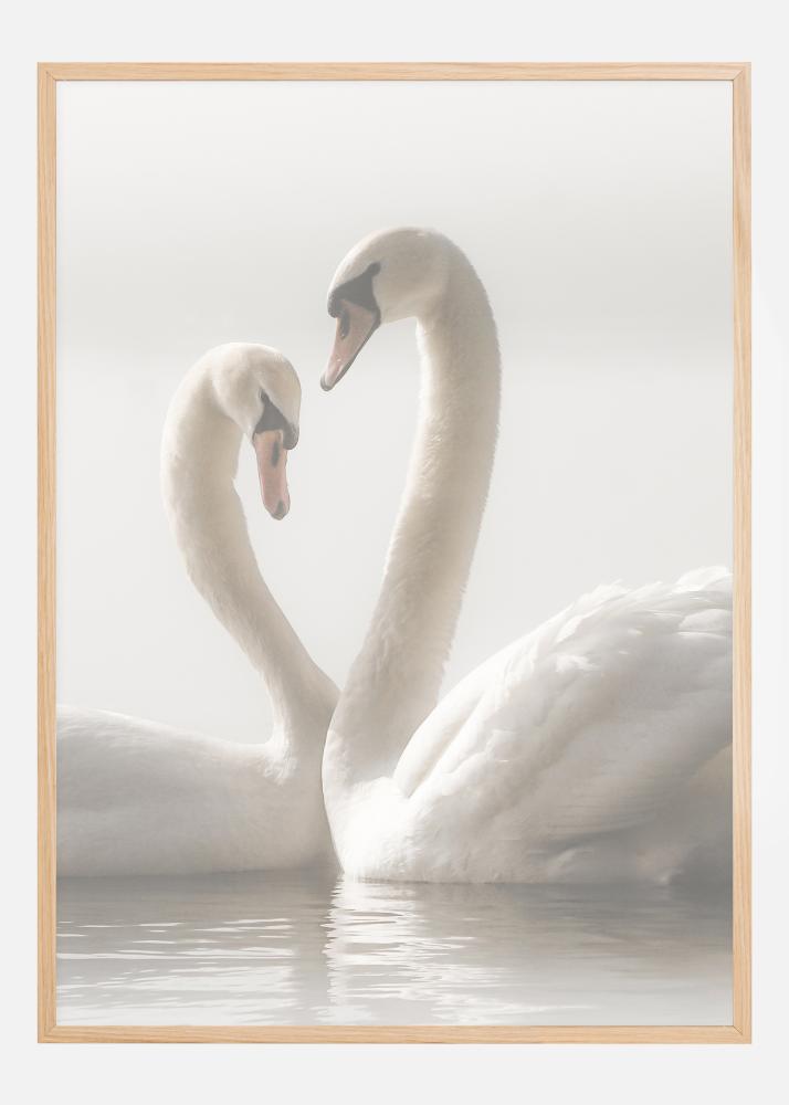 Um póster romântico com dois cisnes nadando juntos. A iluminação suave traz uma tranquilidade harmoniosa para esta imagem onde os cisnes deslizam um em direção ao outro. Os seus pescoços se erguem e formam um coração. Sinta o amor nesta foto encantadora.