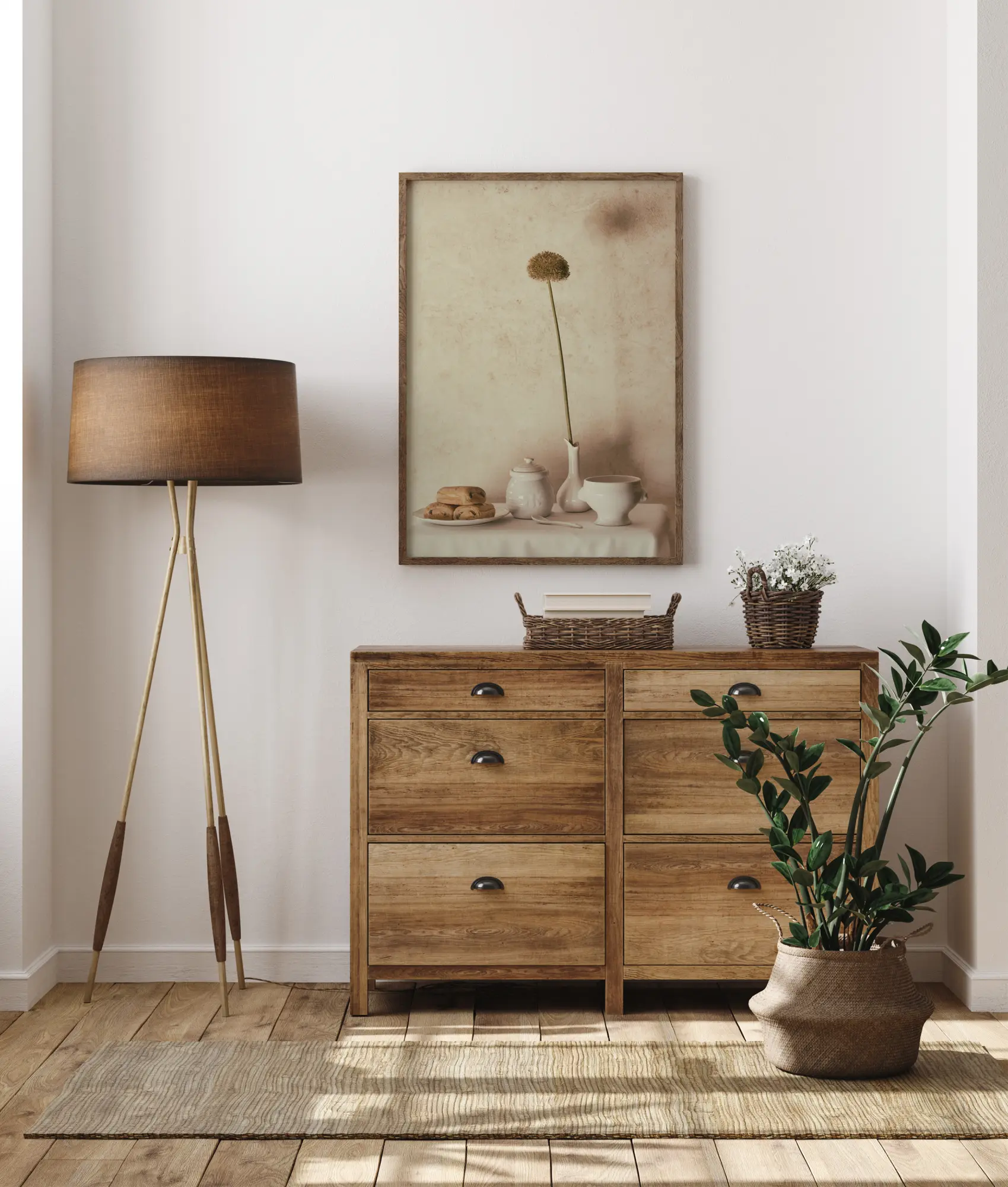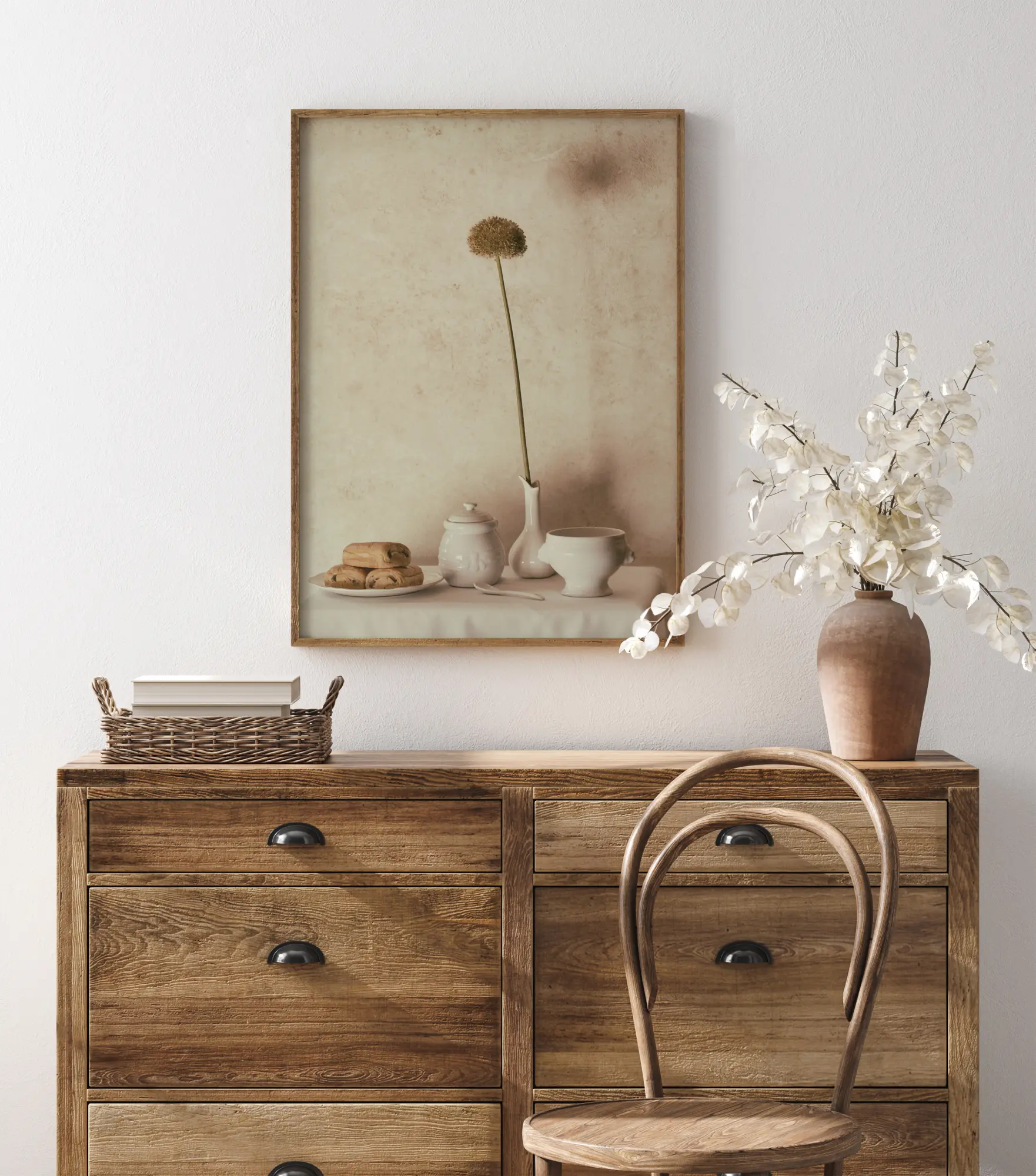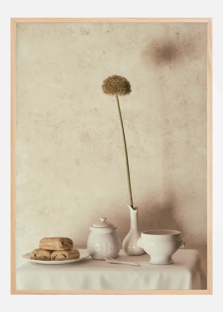 Um póster de natureza morta com pain au chocolate em uma tigela, um pote de mel e um vaso com uma única flor. Este café da manhã adorável é colocado contra uma parede branca neutra para criar uma atmosfera simples, mas eficaz. Imagine-se no continente enquanto toma seu café da manhã com isso em sua cozinha.