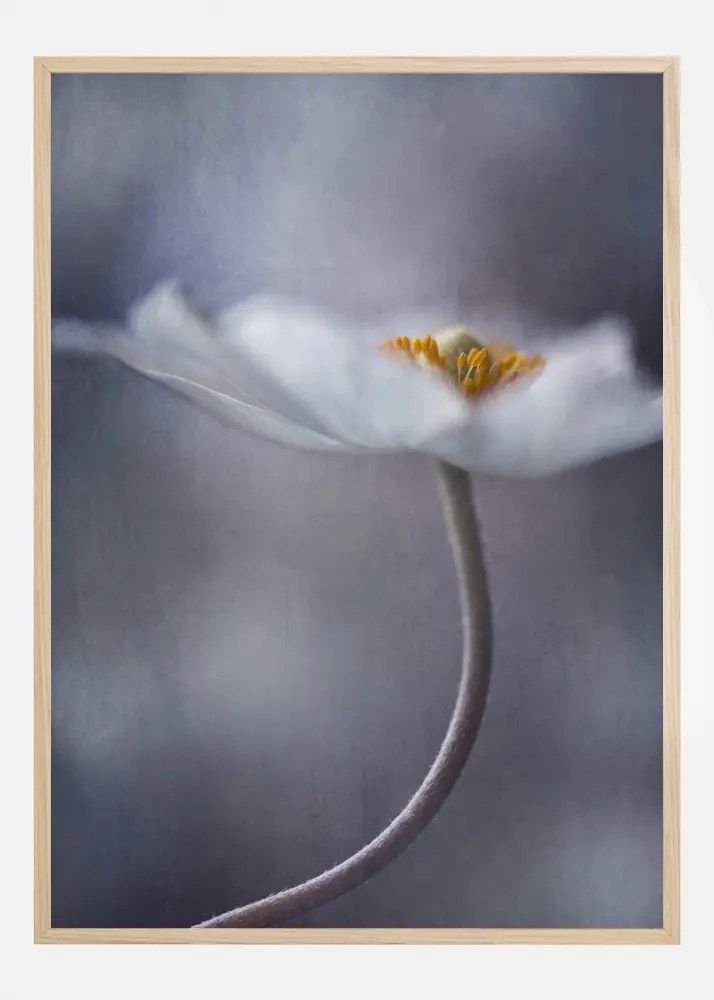 Um póster de flores com um close-up de uma flor branca num fundo cinzento suave. O centro laranja da flor se destaca no fundo suave, criando um ponto focal luminoso e realçando a beleza da flor tanto por dentro quanto por fora. Ela é etérea e mágica e irradia paz.