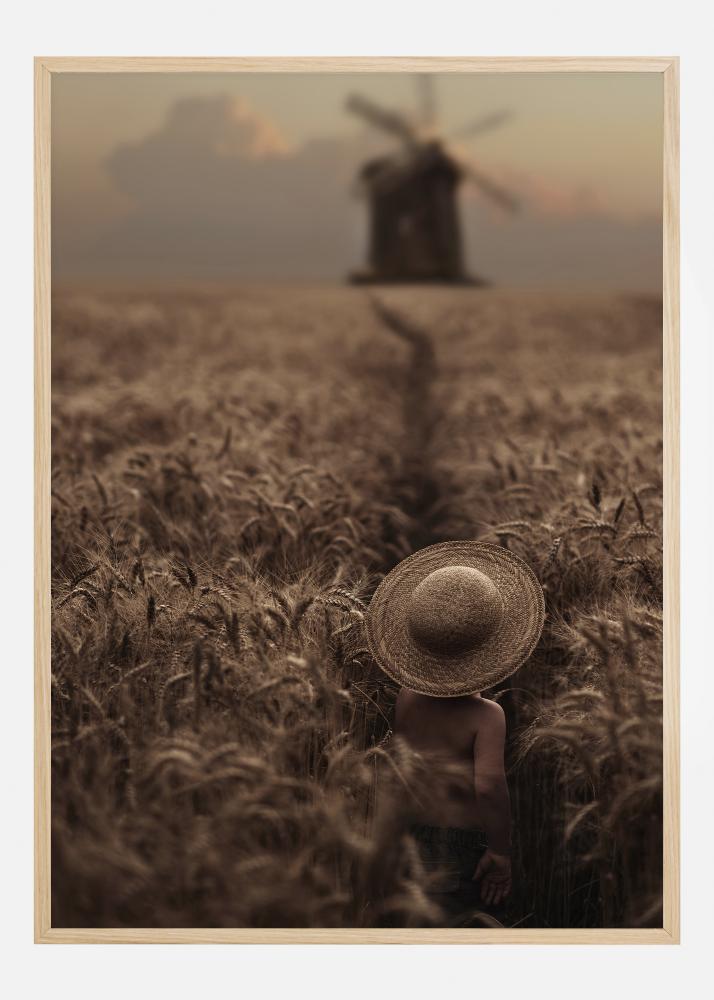 Um póster de retrato de um menino em um campo de trigo com um moinho ao longe. As cores suaves amarelas e rosa criam uma pose verdadeiramente tranquila. Aventure-se em direção a esse moinho de vento junto com o menino usando esta imagem.