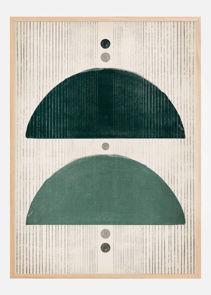 Este pôster é mais do que apenas uma imagem decorativa; é uma interpretação artística contemporânea que une o natural ao estilizado. As três formas circulares, centralizadas entre os blocos em forma de semicírculo, funcionam como um ponto focal que une toda a composição. Esta impressão poderia servir como um elemento de destaque elegante numa parede de uma casa ou escritório minimalista, e os tons verdes calmantes trariam uma sensação de natureza e tranquilidade a qualquer ambiente.