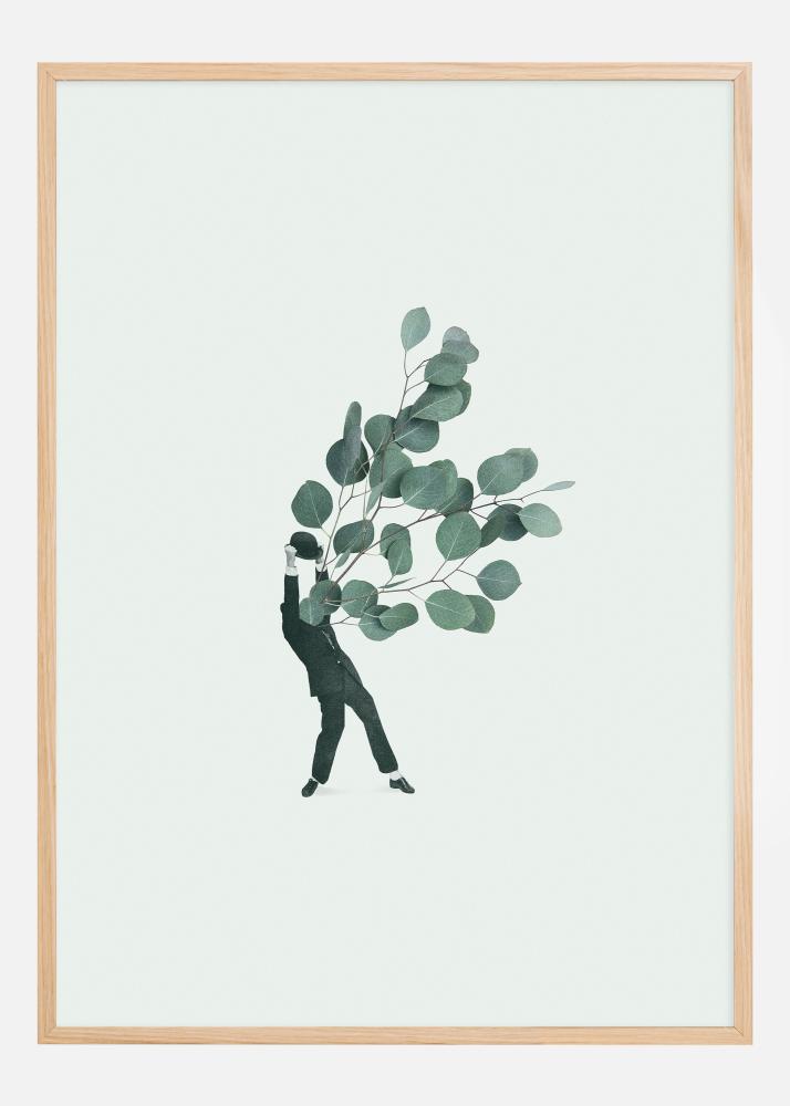 Este pôster artístico e elegante apresenta a silhueta minimalista de uma pessoa carregando um buquê exuberante de folhas de eucalipto, uma expressão visual que é tão simples quanto poderosa. O contorno preto da figura contra o fundo claro contrasta fortemente com os suaves tons verdes das folhas de eucalipto, criando uma sensação de natureza pacífica em harmonia com a presença humana.