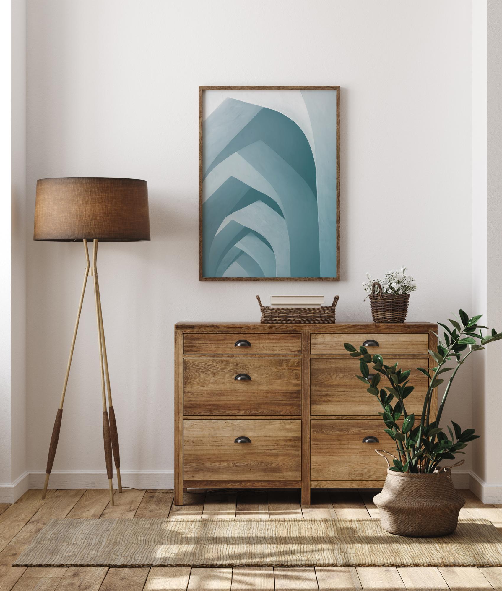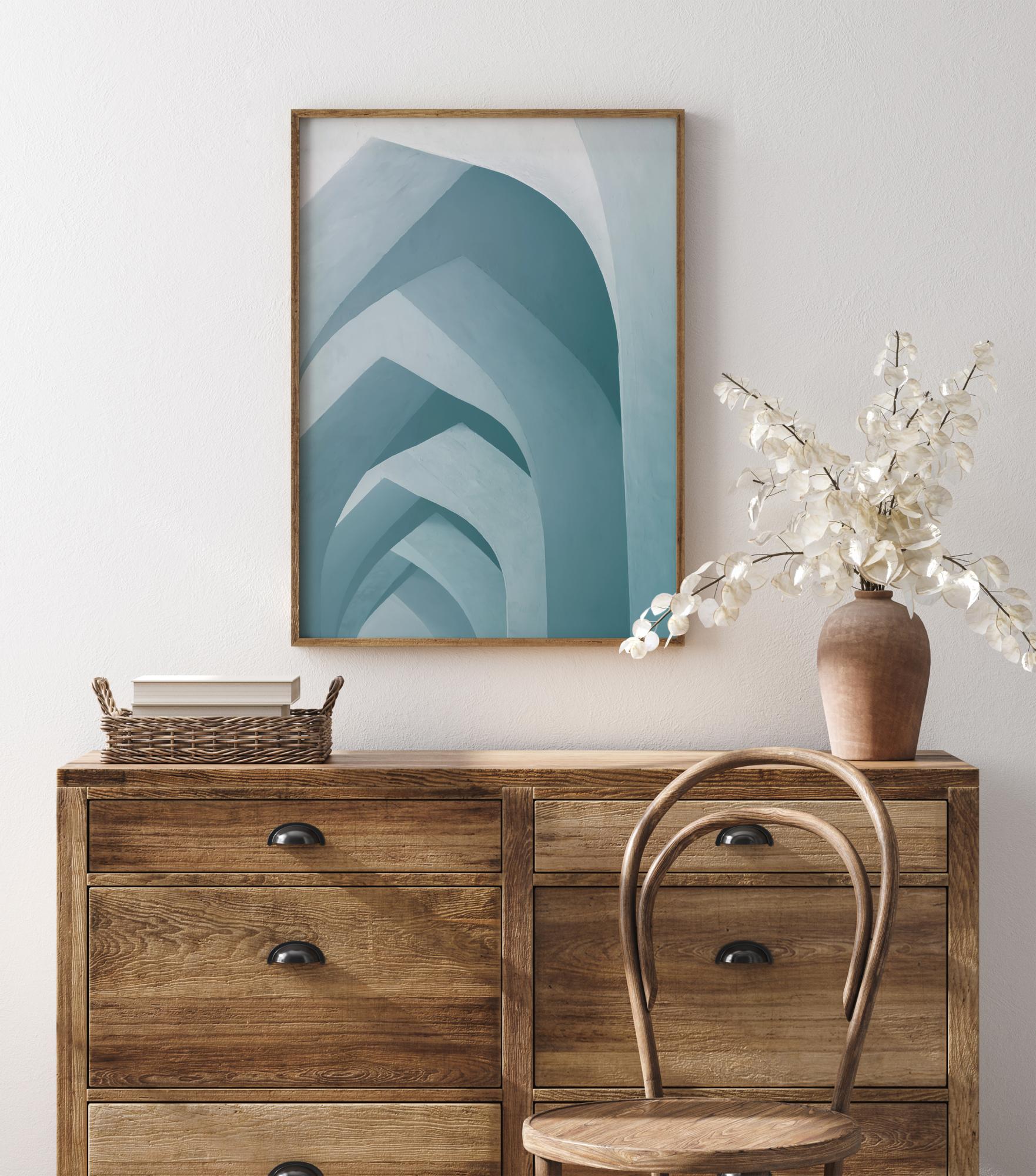 Um póster gráfico com diferentes formas que criam arcos. Cada forma de arco é criada usando blocos de cores em diferentes tons de azul. Escuro e claro são contrastados para criar uma ilusão de profundidade e a sensação de um corredor longo. Pendure isso numa parede branca para tornar as cores ainda mais contrastantes.