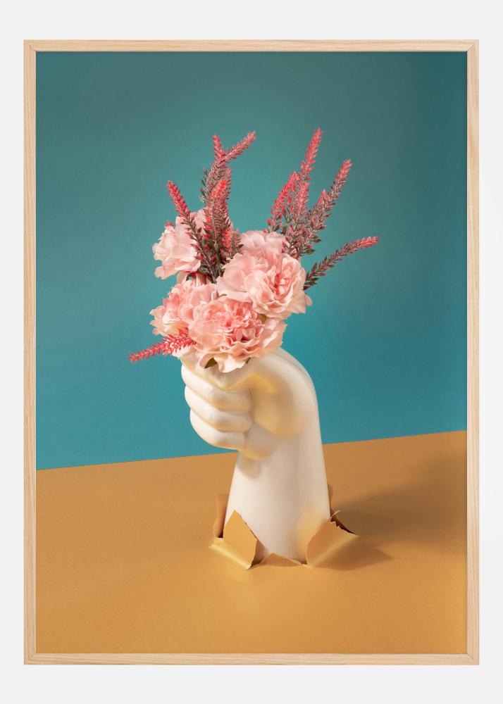 Este pôster criativo e engenhoso retrata uma mão escultural segurando um buquê de flores em flor, criando a ilusão de um vaso. O fundo em tons azuis calmos contrasta lindamente com as cores quentes amarelas e rosas, criando uma sensação fresca e contemporânea. A composição dividida com a mão rompendo a superfície amarela adiciona um elemento de dinamismo e ilusão tridimensional à imagem.