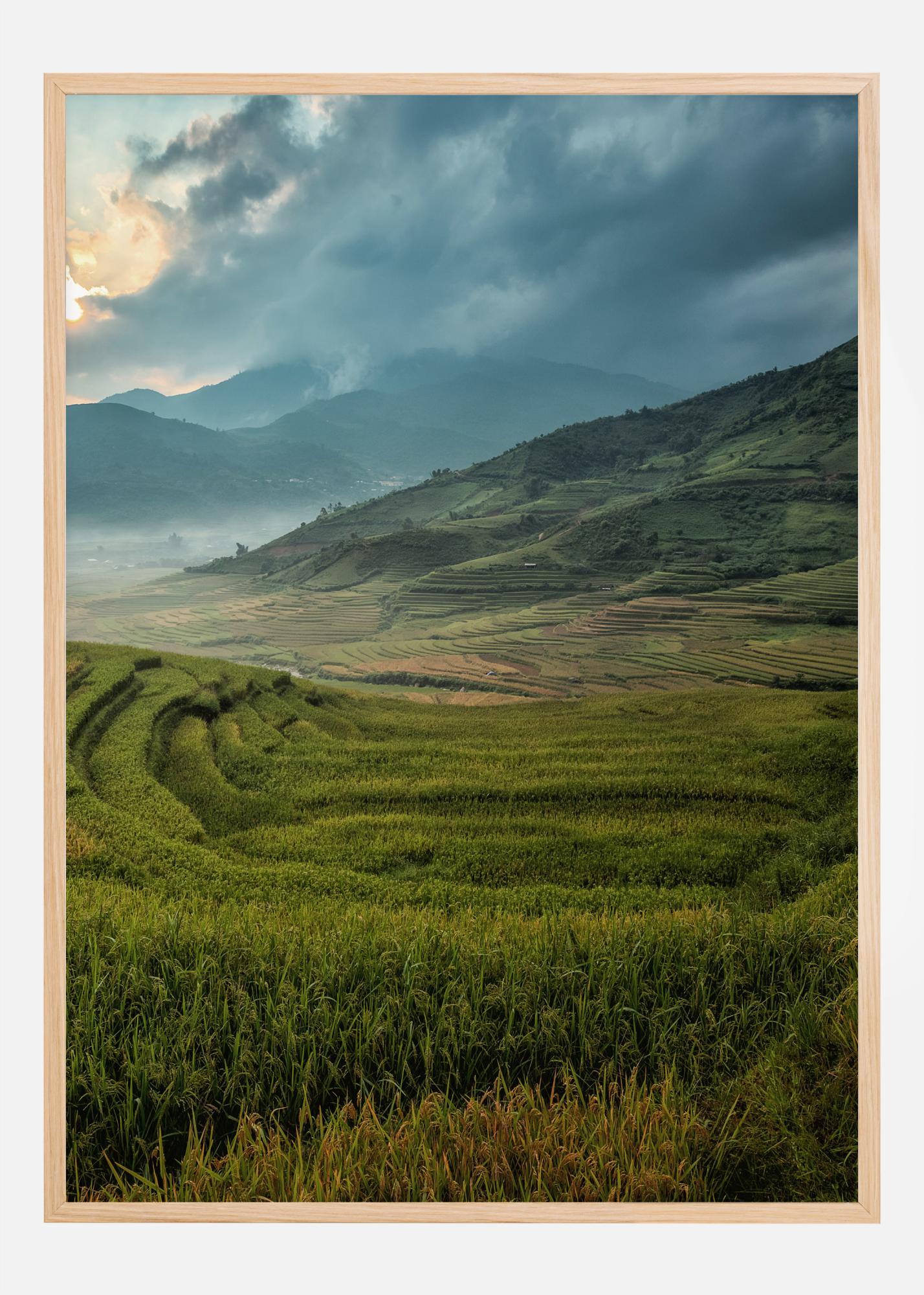 Um incrível póster de paisagem com colinas e campos verde-claros. Nuvens escuras rolam do lado direito e escondem uma das montanhas distantes. Um raio de sol laranja pode ser visto, criando um tom mais quente nesta imagem épica. Tenha a sensação de espaço em sua casa com esta impressão.