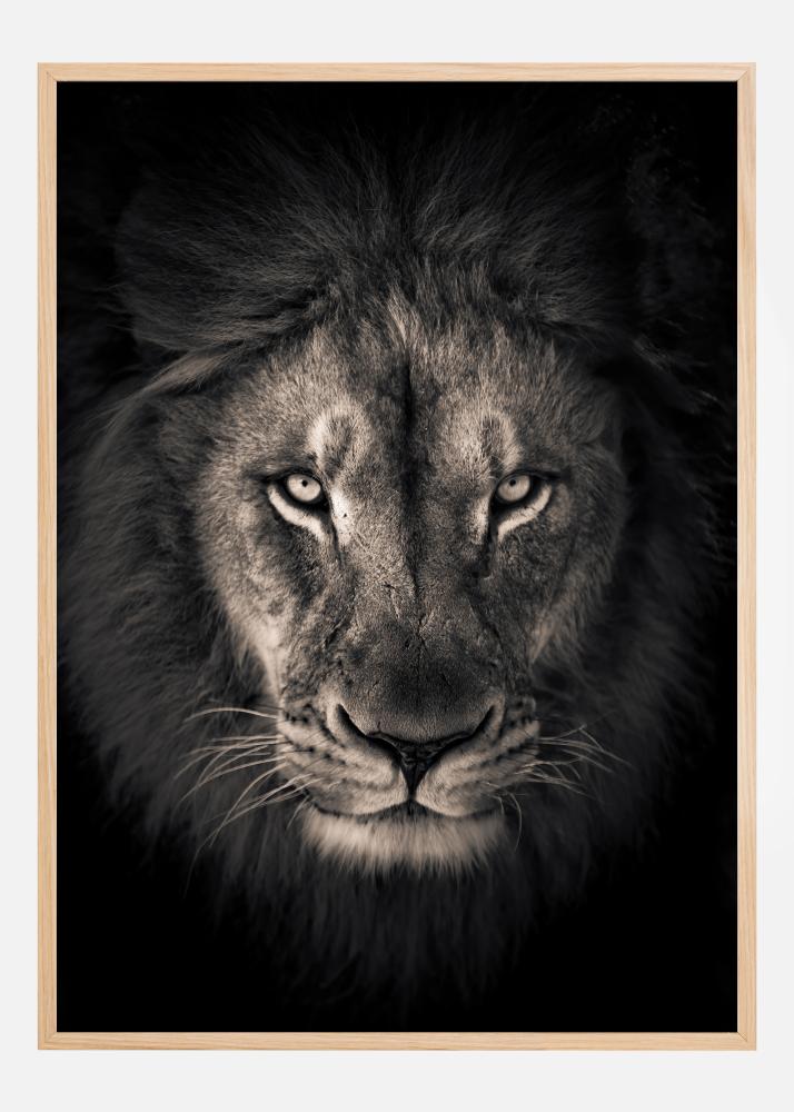 Este poderoso e cativante pôster captura o olhar profundo de um leão, transmitindo uma sensação de sua força e presença. A tonalidade preto-e-branco confere à imagem uma qualidade atemporal e destaca os traços majestosos do leão e a intensidade presente em seus olhos. É uma impressão que irradia autoridade e selvageria, uma representação ideal do 'rei da selva'.