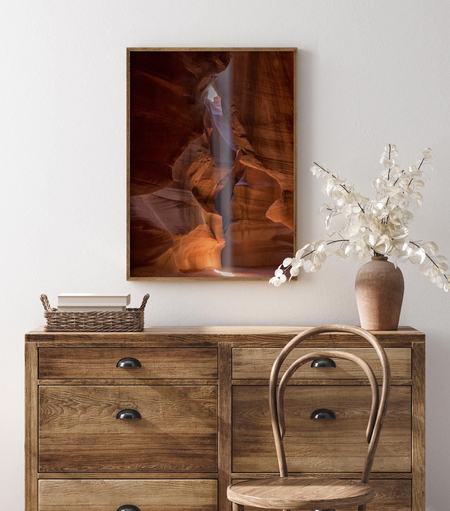 Um póster mágico com um raio de luz viajando por penhascos vermelhos. As curvas suaves dos penhascos vermelhos criam um brilho quente. O único raio de luz cria uma atmosfera mágica neste quarto fechado e ilumina ainda mais os penhascos suaves. Leve esta obra para casa como um complemento llamativo para o seu lar.