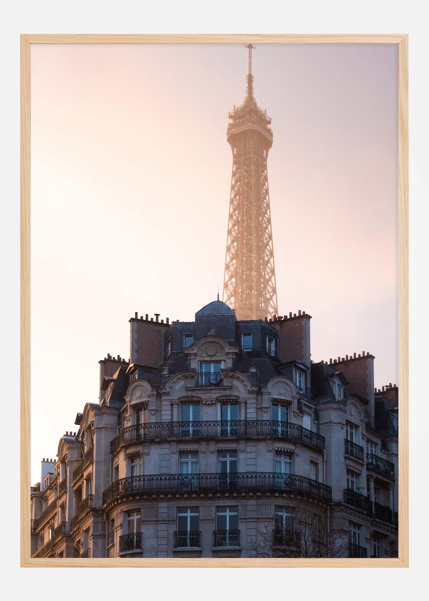 Este pôster captura a essência de Paris com sua representação romântica e encantadora da Torre Eiffel espreitando timidamente por trás dos edifícios parisienses clássicos em estilo Haussmann. O tom quente do pôr do sol oferece um fundo suave, onde as cores pastéis do céu transmitem uma sensação de calma onírica. As cores naturais nesta impressão adicionam uma sensação de elegância e simplicidade, tornando-a um complemento perfeito para qualquer ambiente que necessite de um toque sutil de cultura mundial.