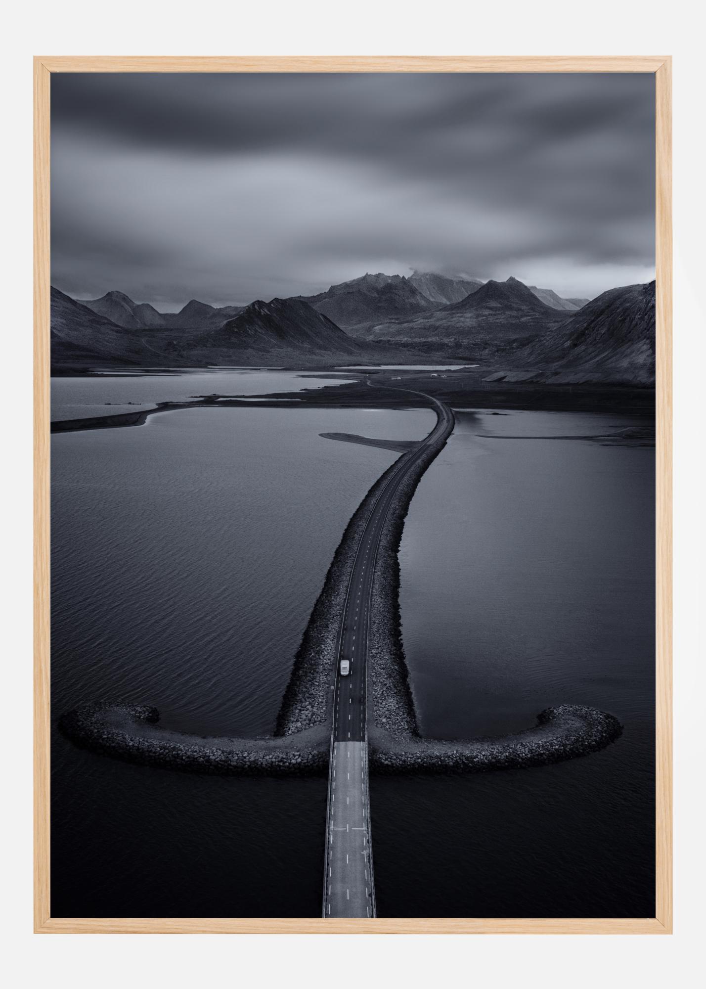 Um póster em tons de cinzento com uma estrada larga que passa por lagos e entre montanhas ao fundo. Um céu cinzento e nublado paira acima. Um único carro branco viaja pela estrada em direção ao longe. Combine com uma parede clara para dar um pouco de cor a esta imagem austera.